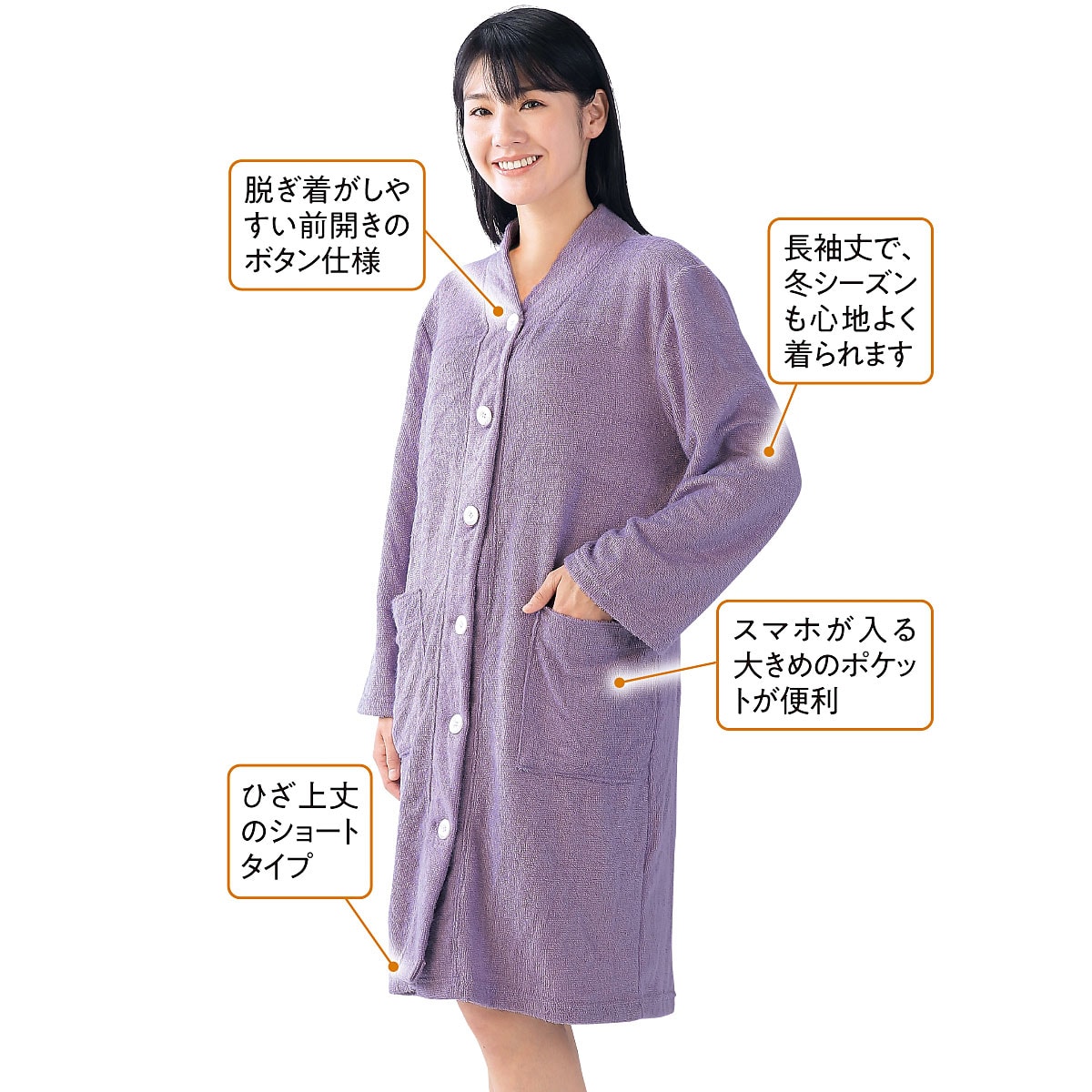 長めの綿混パイル生地が心地よい、バスタオル代わりになるふんわりやわらかなタオルバスチュニックです。ひざ上丈のショートタイプで脚のお手入れ時にも便利な丈感。長袖で寒い季節も心地よく着られます。スマホが入る大きめのポケット付きなのもうれしいポイント。シンプルなデザインでプレゼントにもおすすめです。