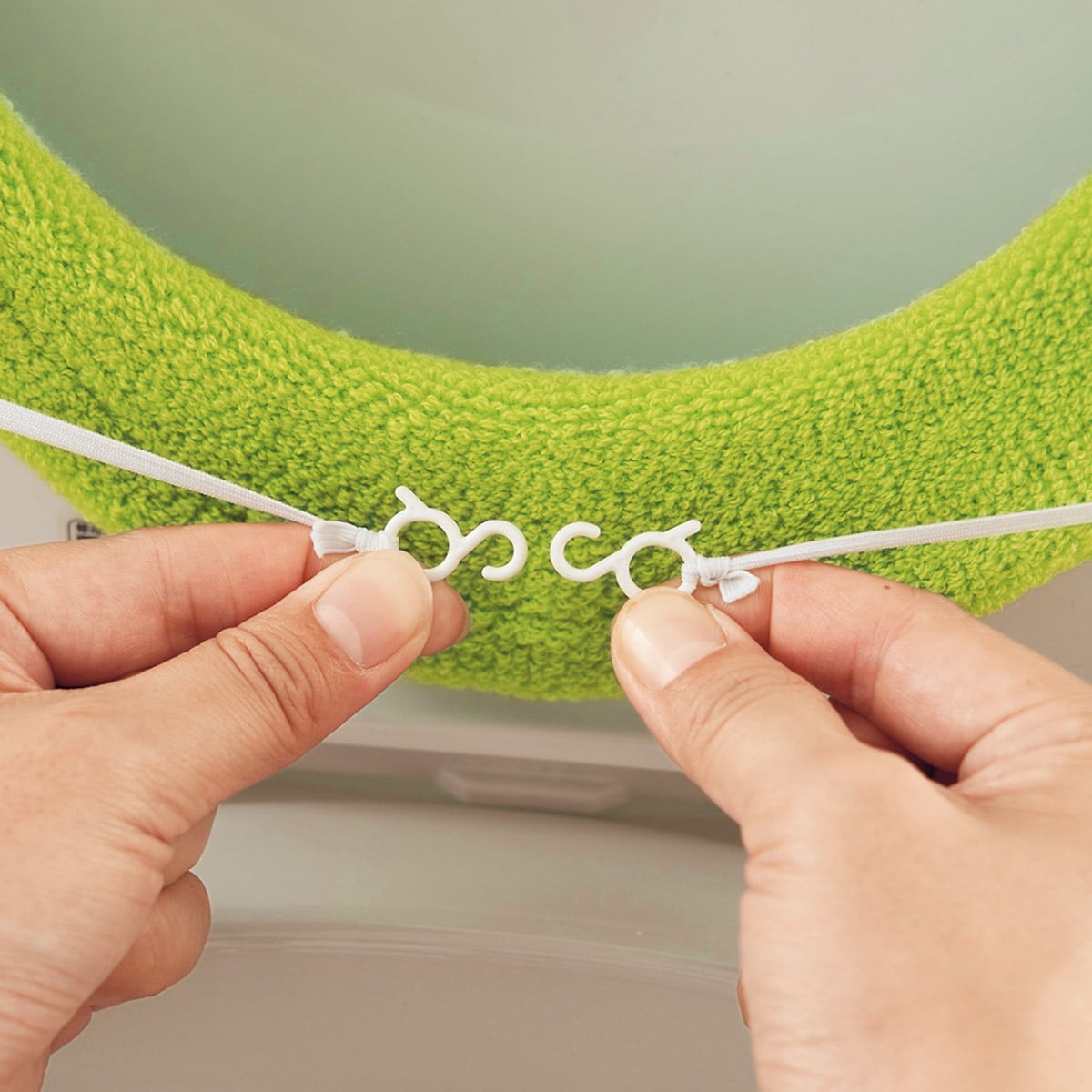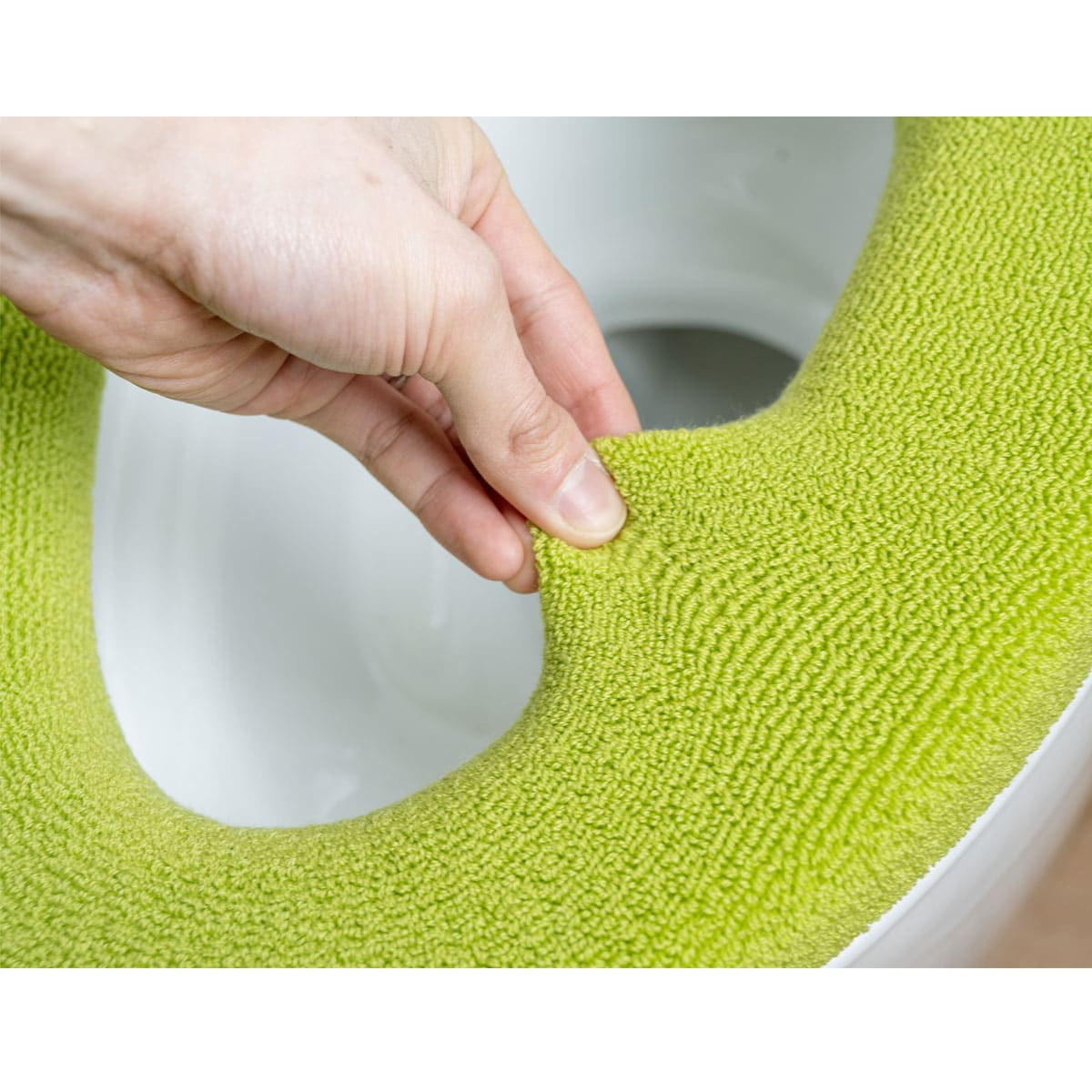 • アップルグリーン(O型)<br>ほどよい厚みでヒヤッとしない、やわらかい肌ざわりの便座カバーです。
