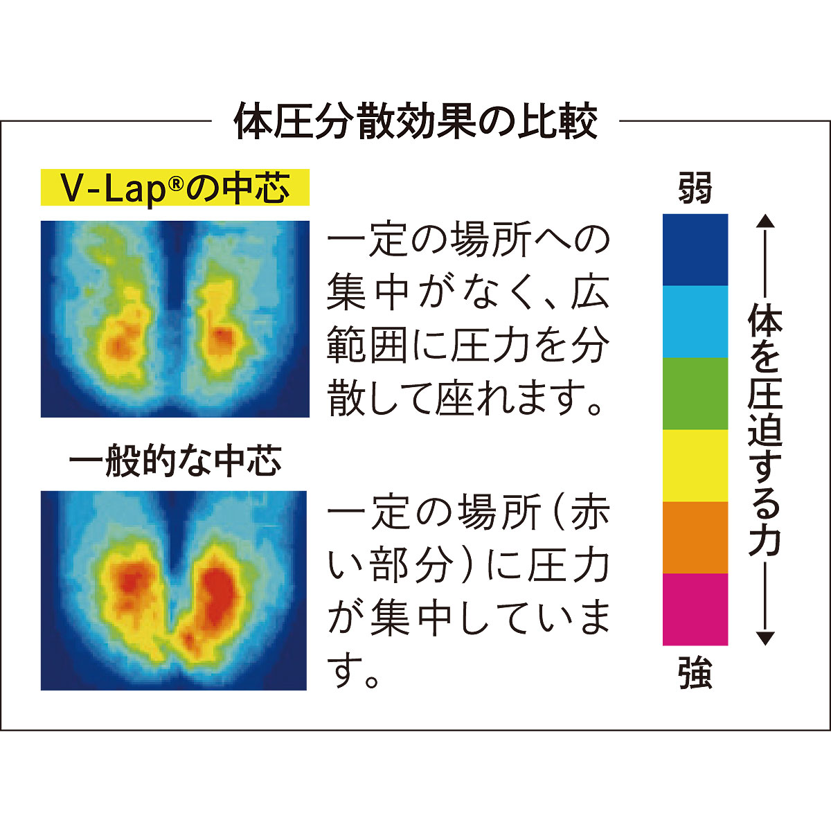 体圧分散効果の比較体圧を分散する中材「VーLap®」を使用。長時間座っていても疲れにくいのが特長です。
