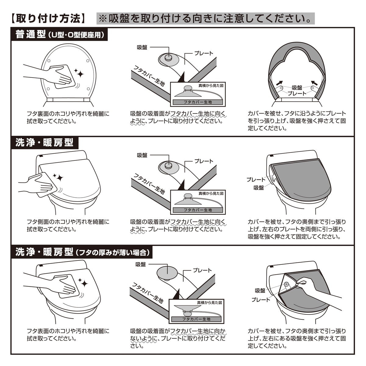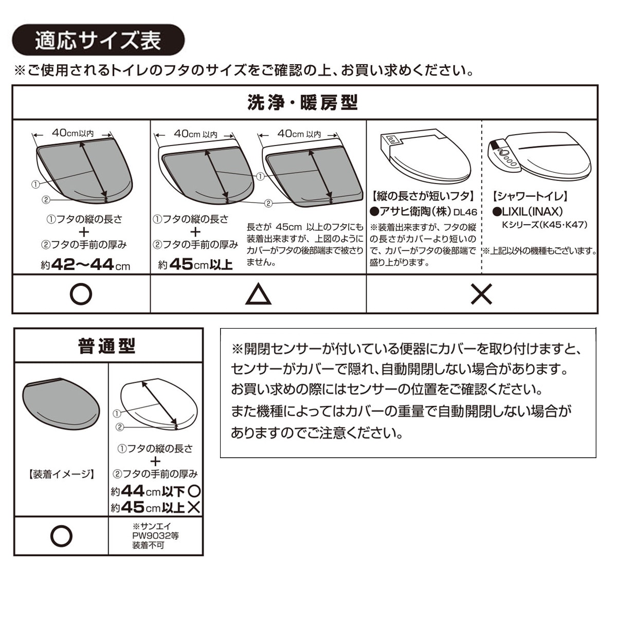 ■アクリル100%(共通)■[フタカバー]適応サイズ(約cm)/横40以下×全長44まで 厚み/約20mm(毛足の長さ/最長約5mm) ■[トイレマット]サイズ(約cm)/60×55 厚み/約10mm(毛足の長さ/最長約5mm) ▼商品によって柄の出方が多少異なります●吸盤で取り付けるタイプです(フタカバー)●裏面にすべりにくい加工(トイレマット)●洗濯機OK(ネット使用)(ドラム式を除く)●中国製[フタカバー]▼便座のフタが自動開閉するタイプには使用できません。▼フタの形状によっては、カバーがフタの奥までかからない場合があります。▼一部のトイレ機種については、フタカバーを装着した際にフタカバーとフタの間に若干の隙間が発生する場合があります。[トイレマット]▼床面の凹凸や使用状況により、すべりにくい加工の効果に差が生じます。▼床材への付着及び床材の変色を防ぐため、1週間に1度床面を拭いてください。▼床面のワックス等が乾ききってからご使用ください。▼乾燥機のご使用はお避けください。▼お洗濯の際は、必ず洗濯ネットをご使用ください。▼床暖房のある場所でのご使用はお避けください。【返品・交換不可】※商品の特性上、不良品以外の返品・返品交換はお受けできません。