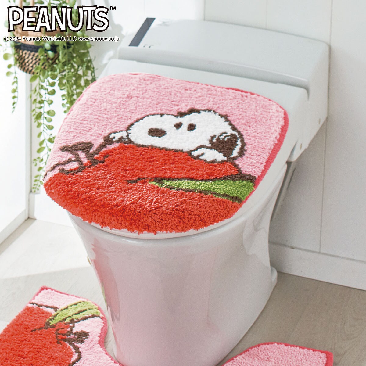 レッドフレッシュな明るい色づかいで元気をくれる、スヌーピー トイレフタカバーです。