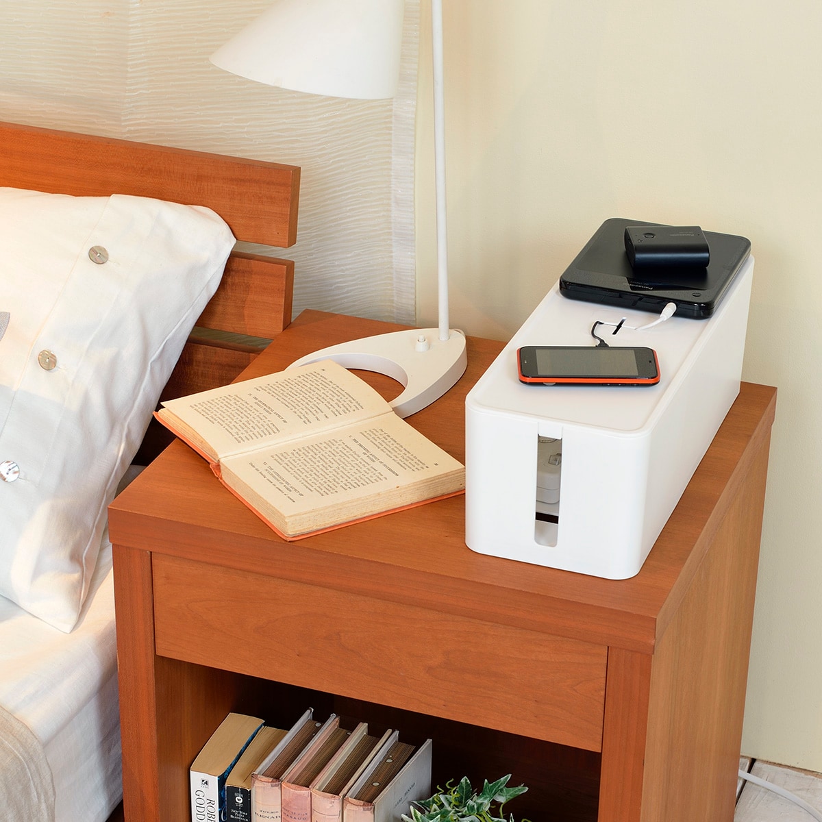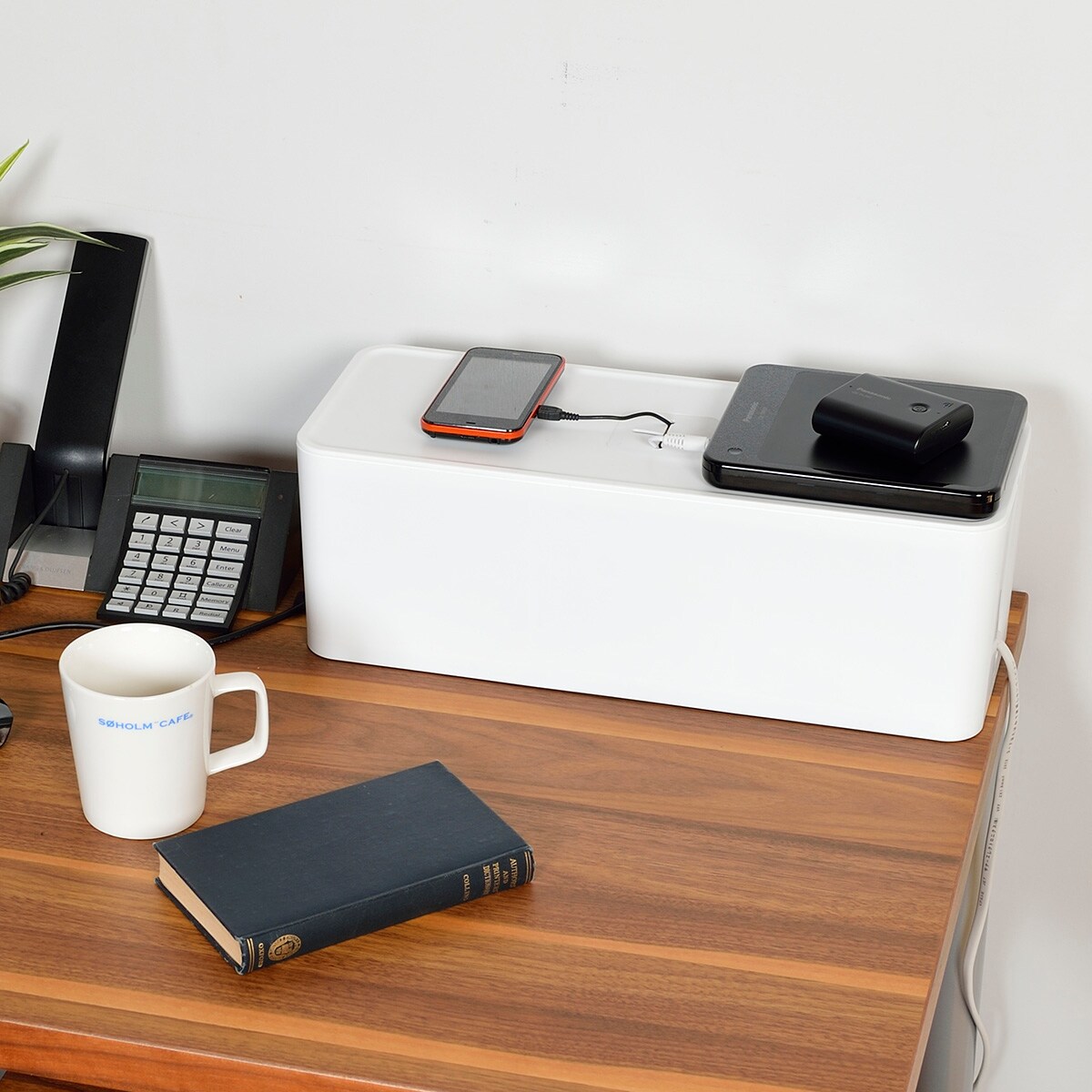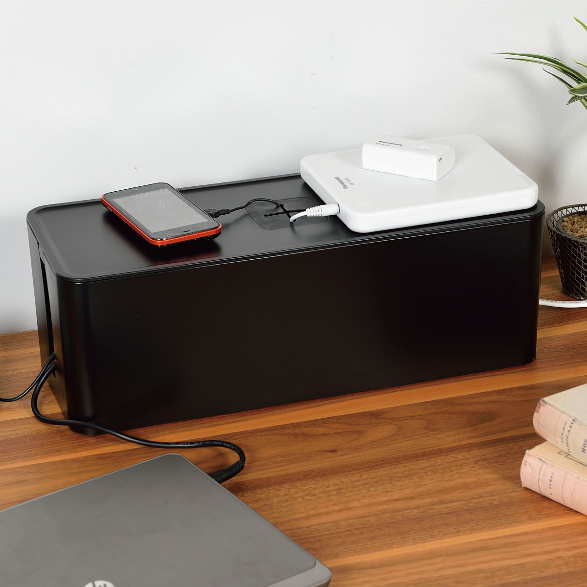 充電混雑をすっきり解消! テレビ横やデスク周りなどゴチャつくコンセントを収納できるケーブルボックスです。長さ32cm以内(6口)のケーブルタップが収納できます。