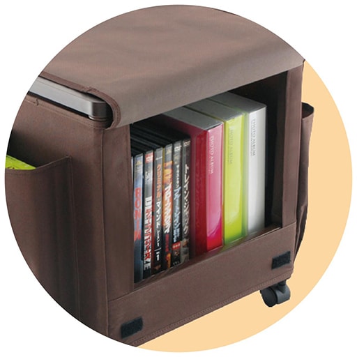 文具や新聞などをひとまとめに収納できるコンパクトなワゴン。リビングやダイニング、寝室などのテーブル脇などでも便利に使えます。テッシュホルダー、A4サイズがすっぽり入る大型ポケット、長いリモコンの収納に最適なロングポケット、よく使う小物類をまとめて入れられるショートポケットなど大きさに合わせて収納出来ます。ワゴン内部には本など少しかさが高い物を収納でき、1つのワゴンにたっぷり収納できます。キャスター付きで移動ラクラク。組立は工具不要で差し込むだけなので、女性でもラクラク組み立てられます。
