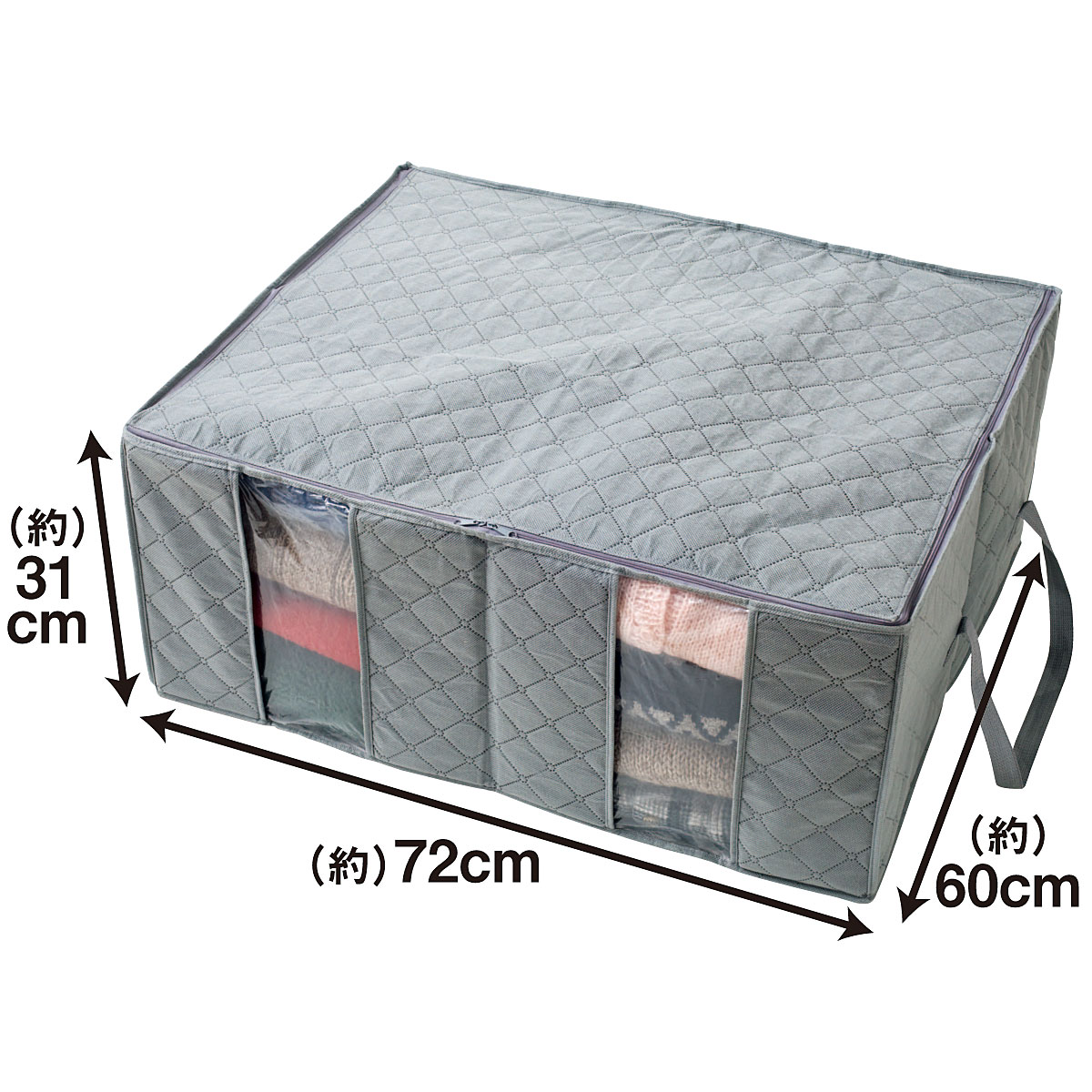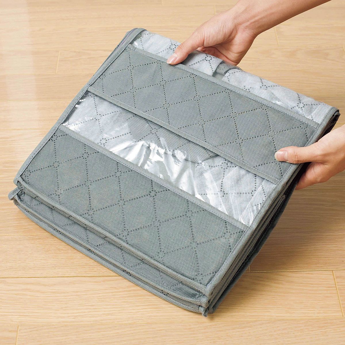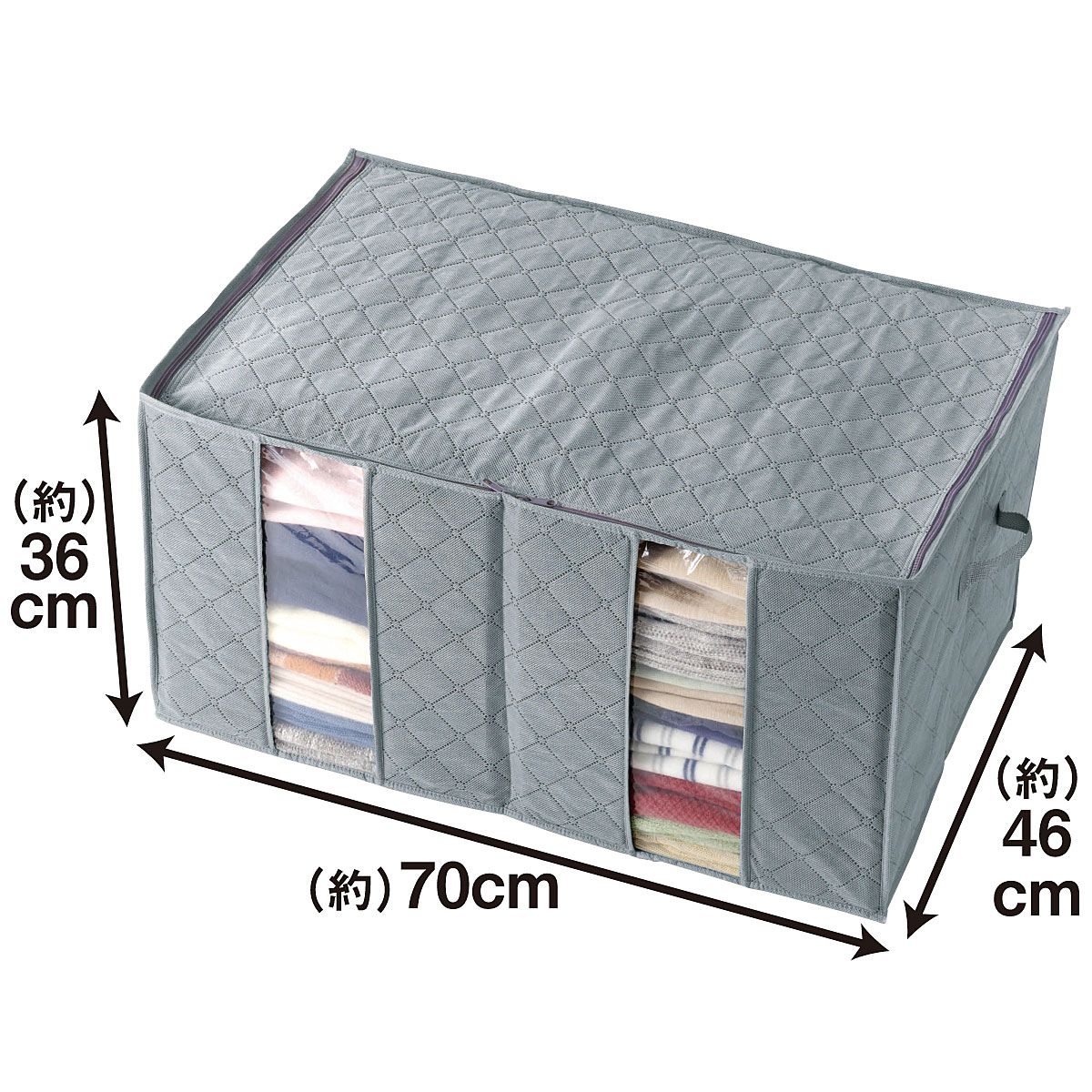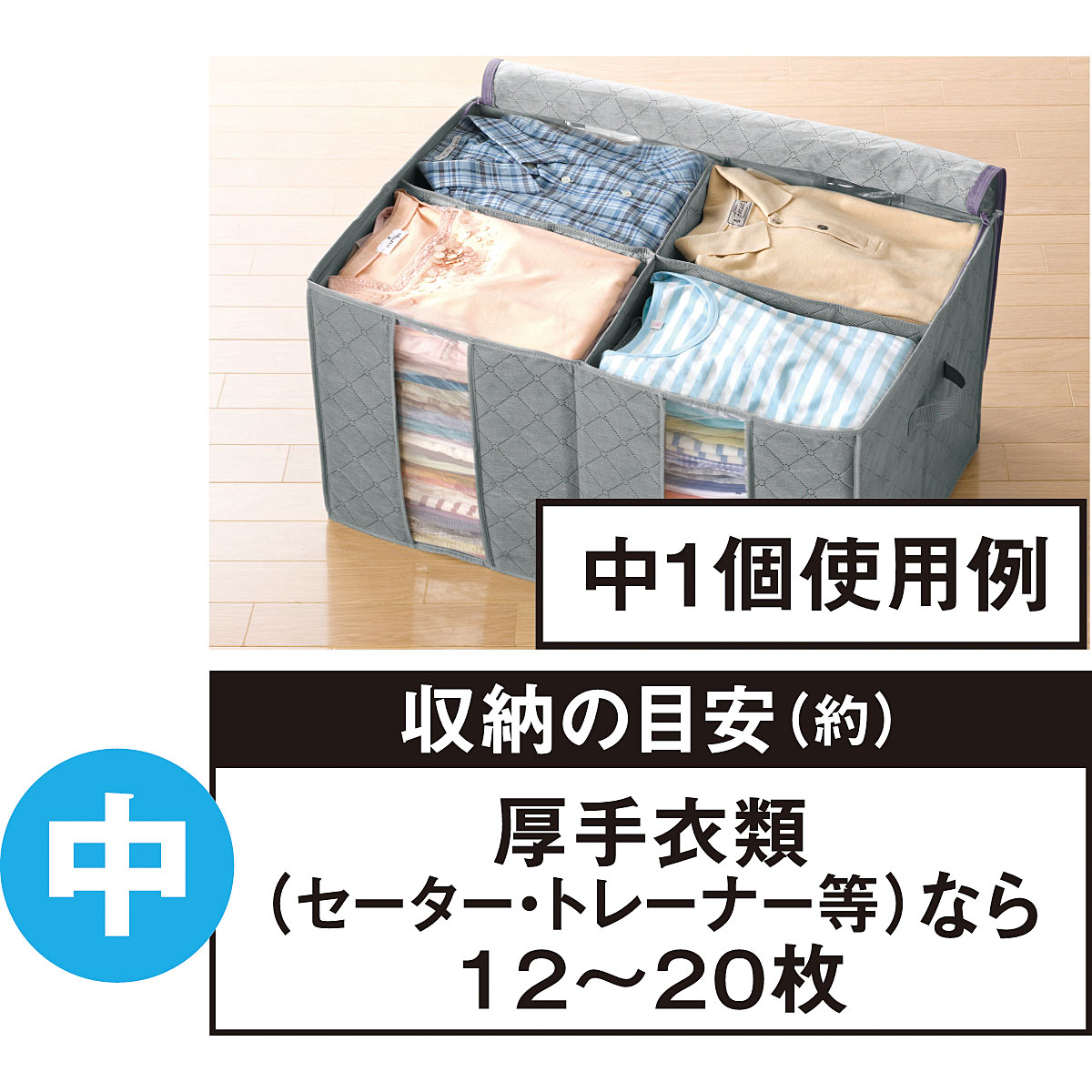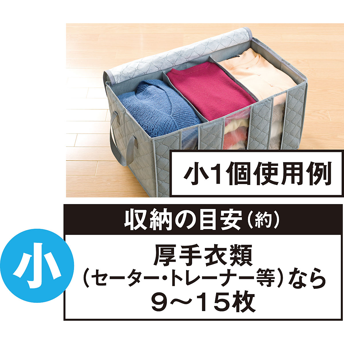 三層構造だから、布製ケースでも積み重ねてへたれない! 間仕切り付きで、たっぷり収納できる衣料整理袋です。中身が見える窓付きで衣類を探しやすいのもうれしいポイント。押し入れに、クローゼットに、お住いのスタイルを選ばず使えます。大・小といくつか揃えれば、すっきり整理整頓できます。※中の仕切りは底面、側面ともに縫い付けてありますので、取り外しや倒してのご使用はできません。