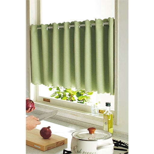 レールがない小窓や縦長の窓などに、つっぱりポールで簡単に掛けられるカフェカーテン。裾のあしらいが小窓を素敵に演出。1級遮光で日差しをしっかり遮り、さらに防炎機能付きなので高層マンションやキッチンの窓におすすめです。
