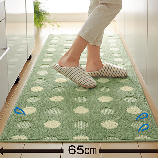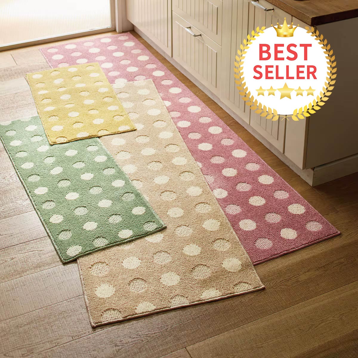 優しい色合いの水玉マット、かなり気に入っています。サイズも豊富で踏み感が気持ち良く、なにより可愛らしい水玉柄で飽きがきません。裏面は本当に滑りゼロです。今回で4度購入させて頂きました。このキッチンマットがず〜と販売される事を願っています。