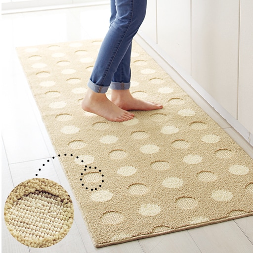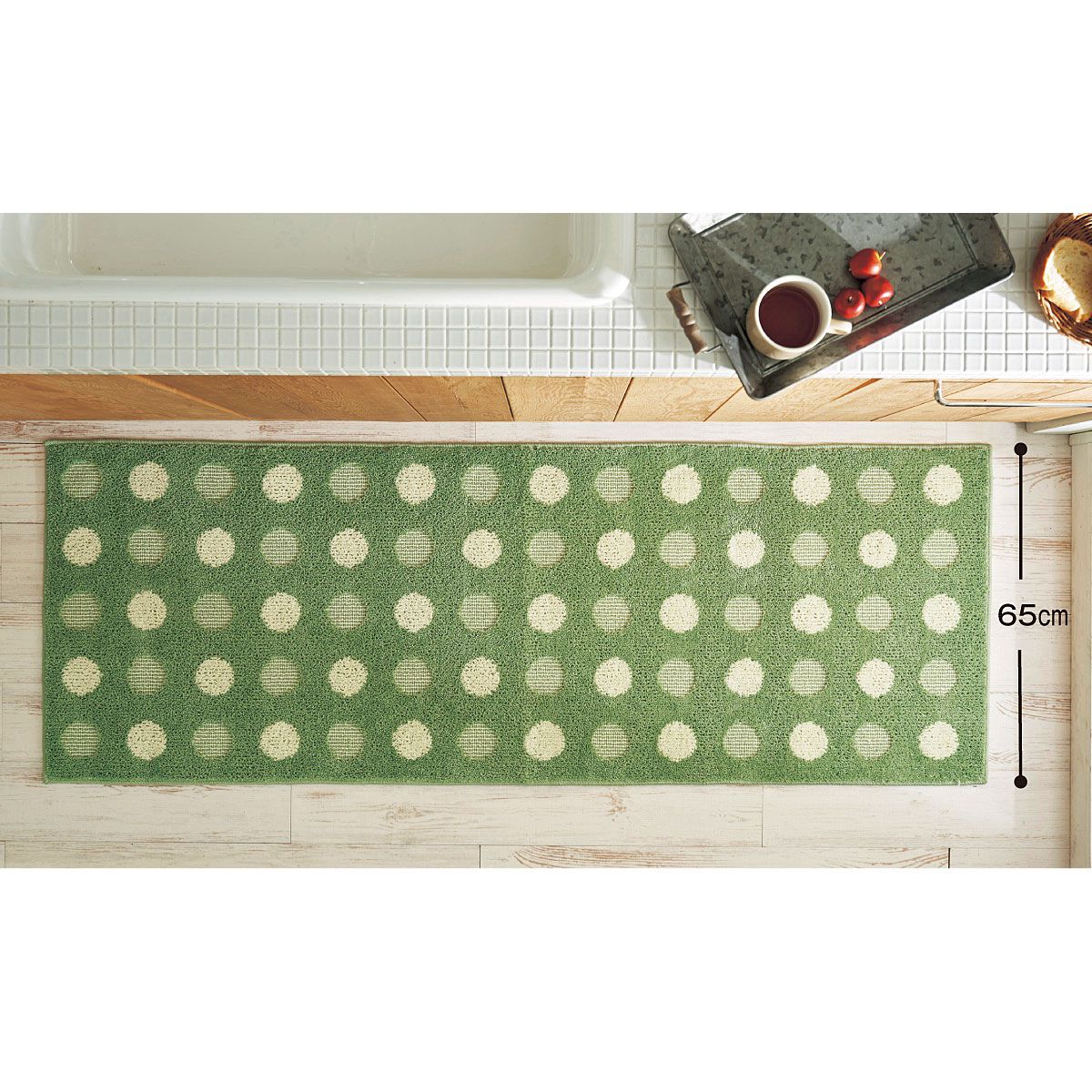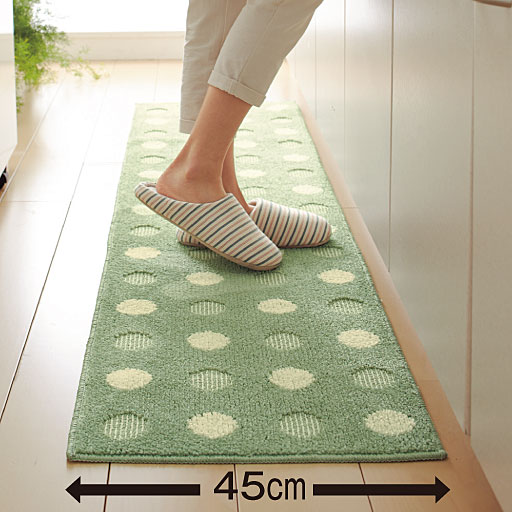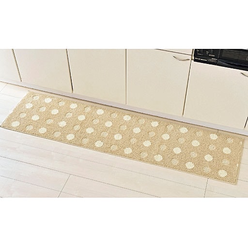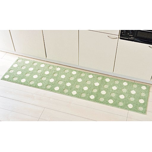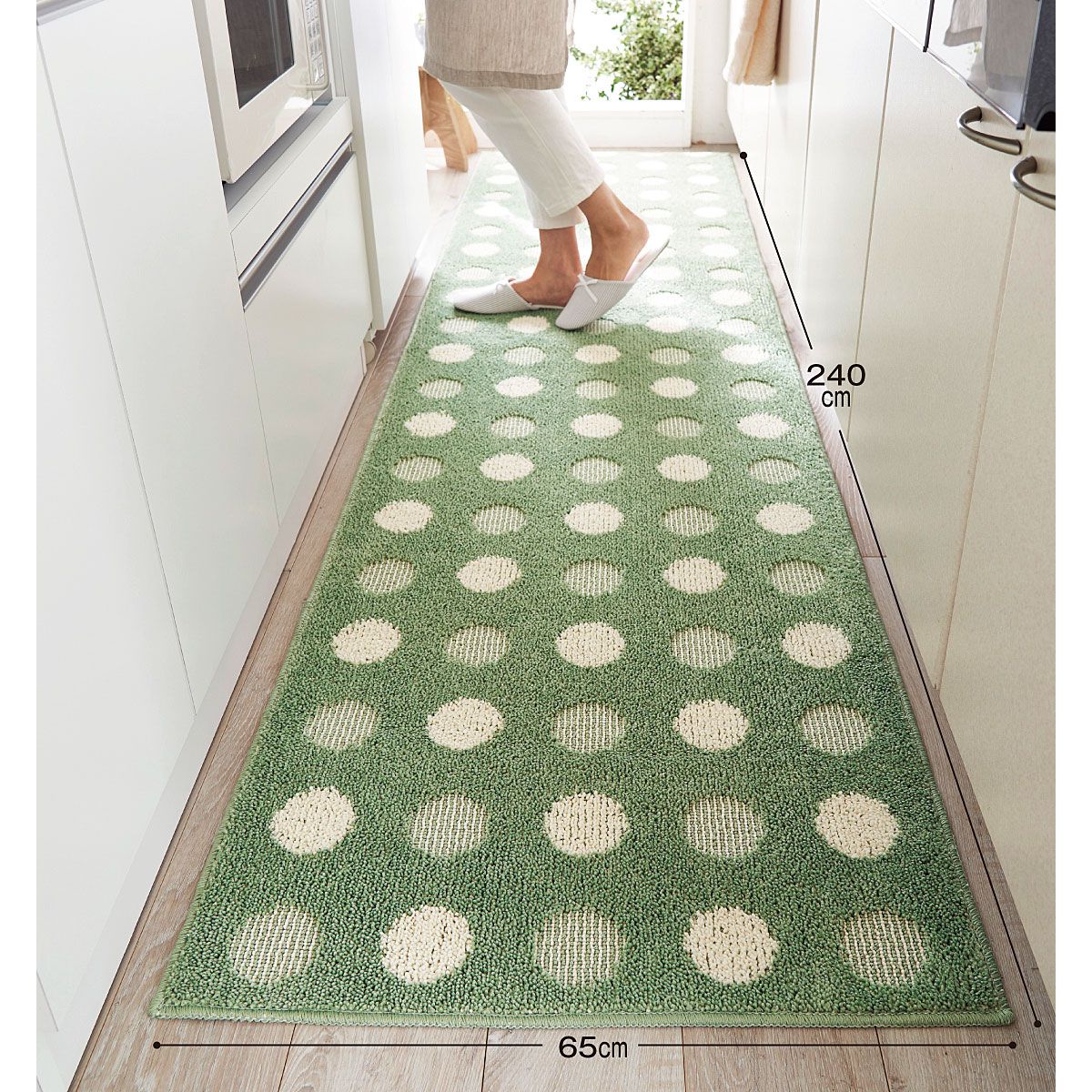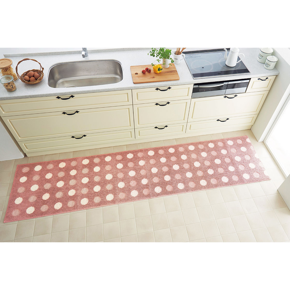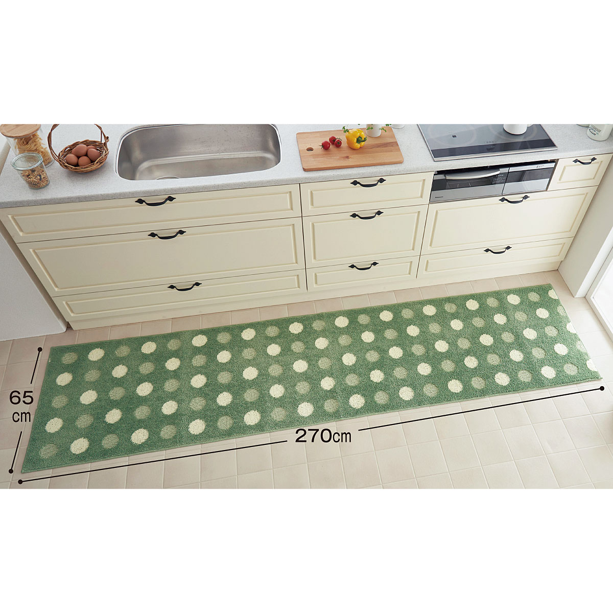 横幅90cmから270cmまでを全13サイズで豊富に取り揃えた、お買い得価格のキッチンマットです。カットパイルとループパイルをミックスした弾力のある踏み心地で、玄関や窓前のマットとしても、廊下敷きとしてもおすすめ。サイズ違いを組み合わせて、コーナー使いもできます。裏面は滑り止め加工を施しているのでズレにくく、掃除機もスムーズにかけられます。汚れたら洗濯機で丸洗いできるので、清潔にお使いいただけます。シンプルなドット柄がお部屋を明るい印象に。