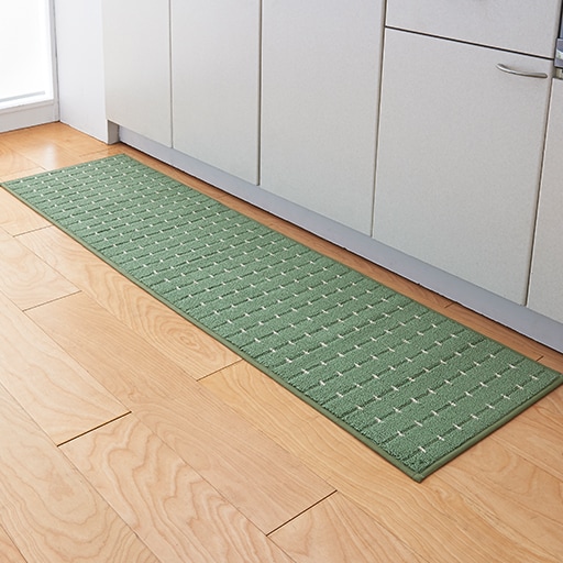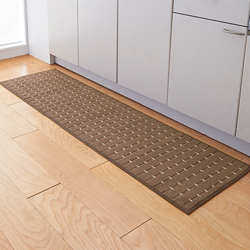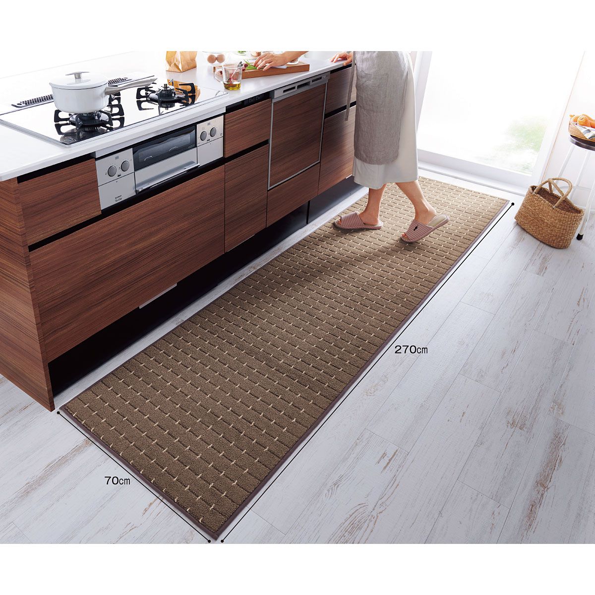 横幅約90cmから270cmまでを全12サイズで豊富に取り揃えた、お買い得価格のキッチンマットです。踏み心地がよく、遊び毛が出にくい密度の高いループパイルを使用。汚れが目立ちにくいのも魅力です。玄関や窓前のマットとしても、廊下敷きとしてもおすすめ。サイズ違いを組み合わせて、コーナー使いもできます。裏面はすべりにくい加工を施しているのでズレにくく、掃除機もスムーズにかけられます。汚れたら洗濯機で丸洗いできるので、清潔にお使いいただけます。