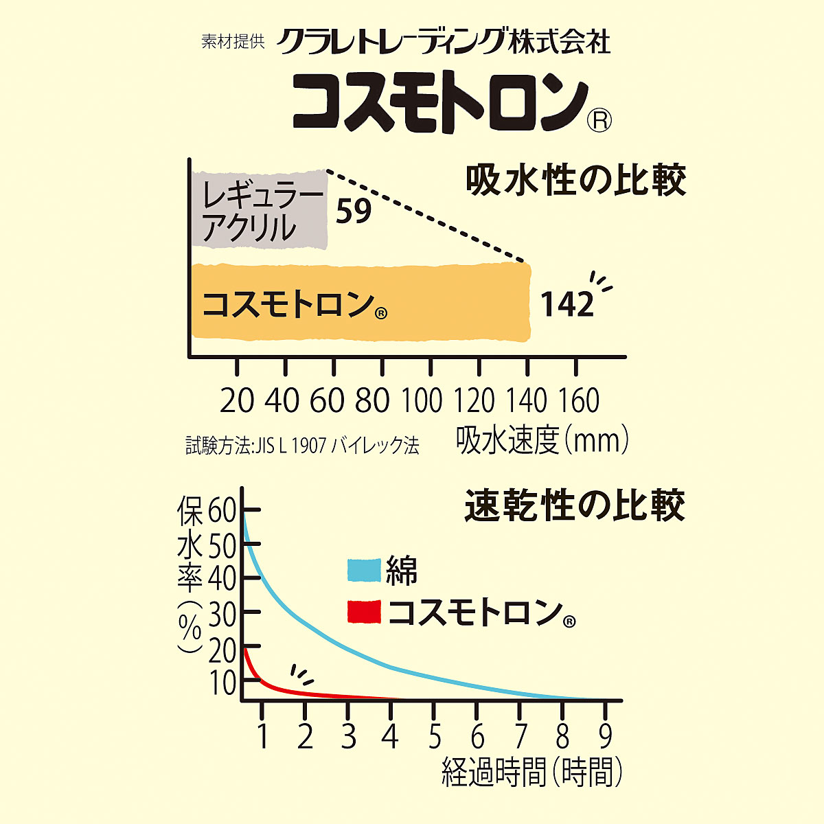 通常アクリル糸の2倍以上の吸水力! すばやく水分を吸収・発散させるので表面をサラサラに保ちます。