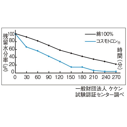 洗濯処理を行い、予備乾燥の後、20℃、65%R.H.の環境下で秤量。その後、試験片を同環境で吊干しし、所定時間毎に秤量。※遠心脱水直後の残留水分を100とした場合の経時変化をグラフ化したものです。