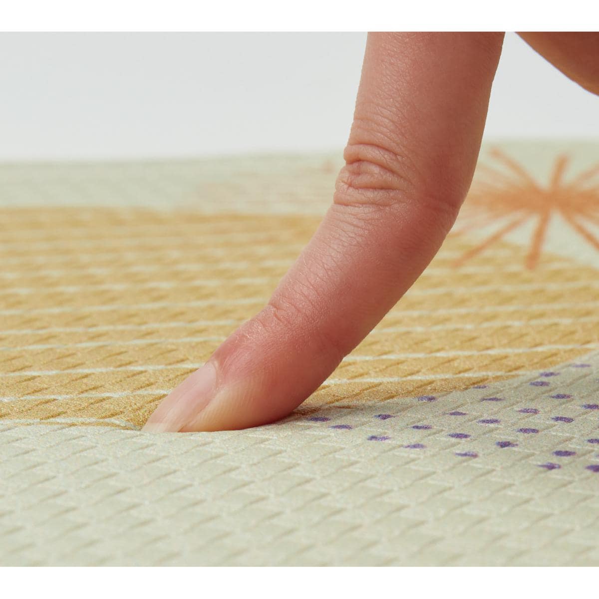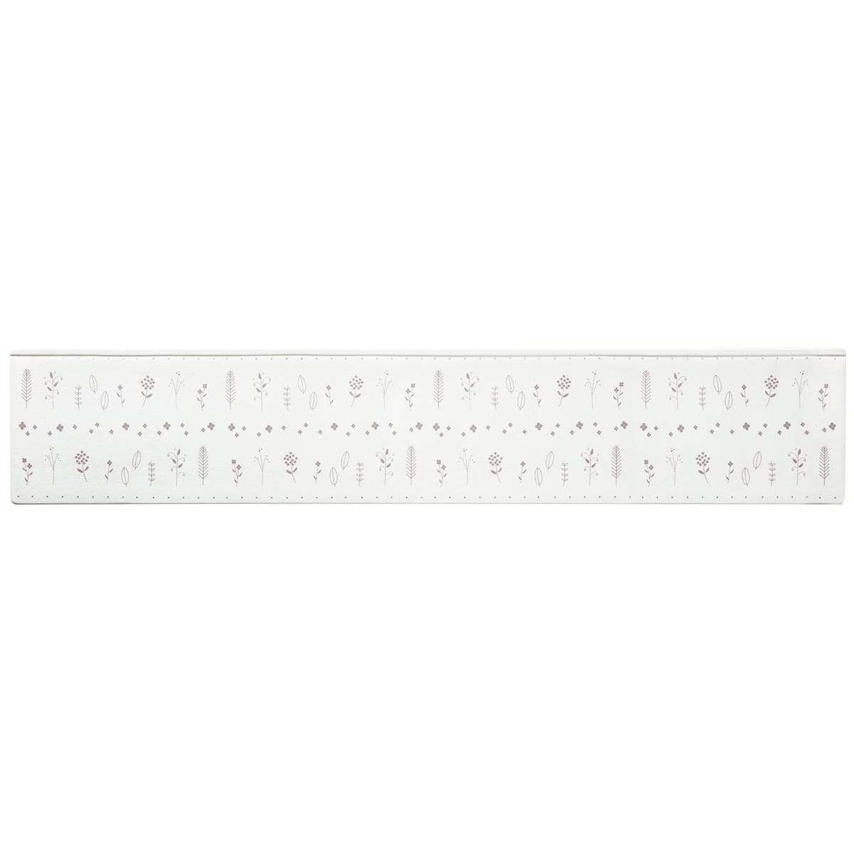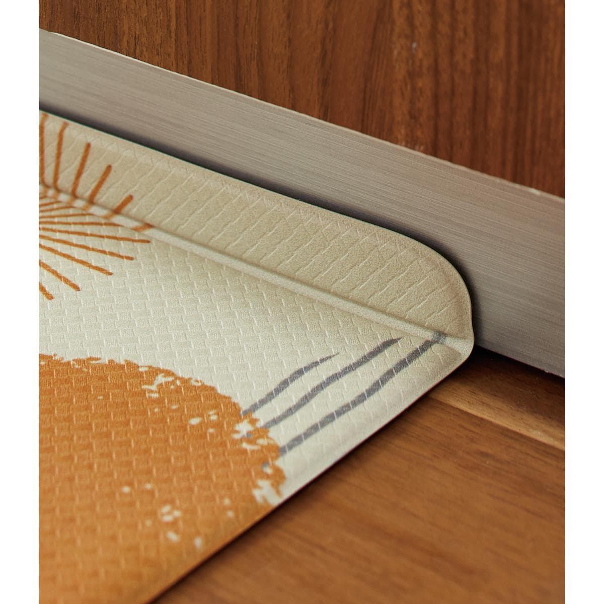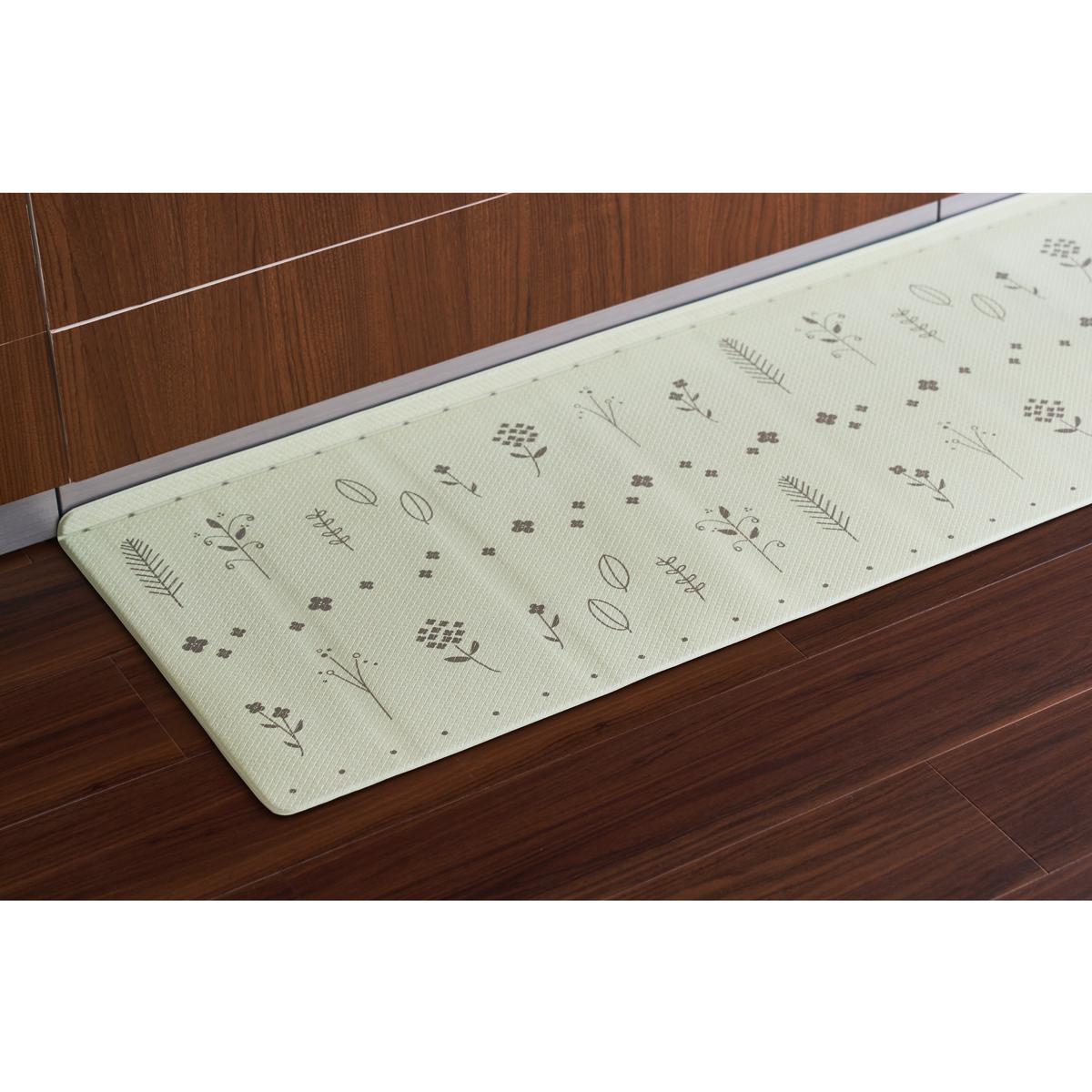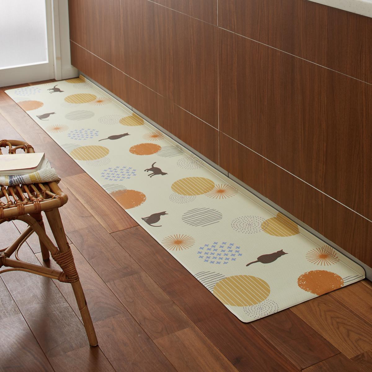 キッチンのあのすき間にピッタリ! 横幅に小さく折り目加工がしてあり、垂直に曲げてキッチンの壁と床にぴったり設置すると、細かいゴミのたまりを防いでお掃除が簡単に。ありそうでなかったキッチンマットです。クッション性に優れたPVC素材はもっちりとした踏み心地で底つき感がなく、立ち仕事も疲れにくい。汚れや水分が染み込まないのでお手入れもラクラクです。さらに抗菌防臭・防炎機能も備えました。裏面はすべりにくい素材でズレにくい。キッチンのアクセントになるかわいい柄をご用意しました。汚れたら手洗いできるので清潔に使えます。