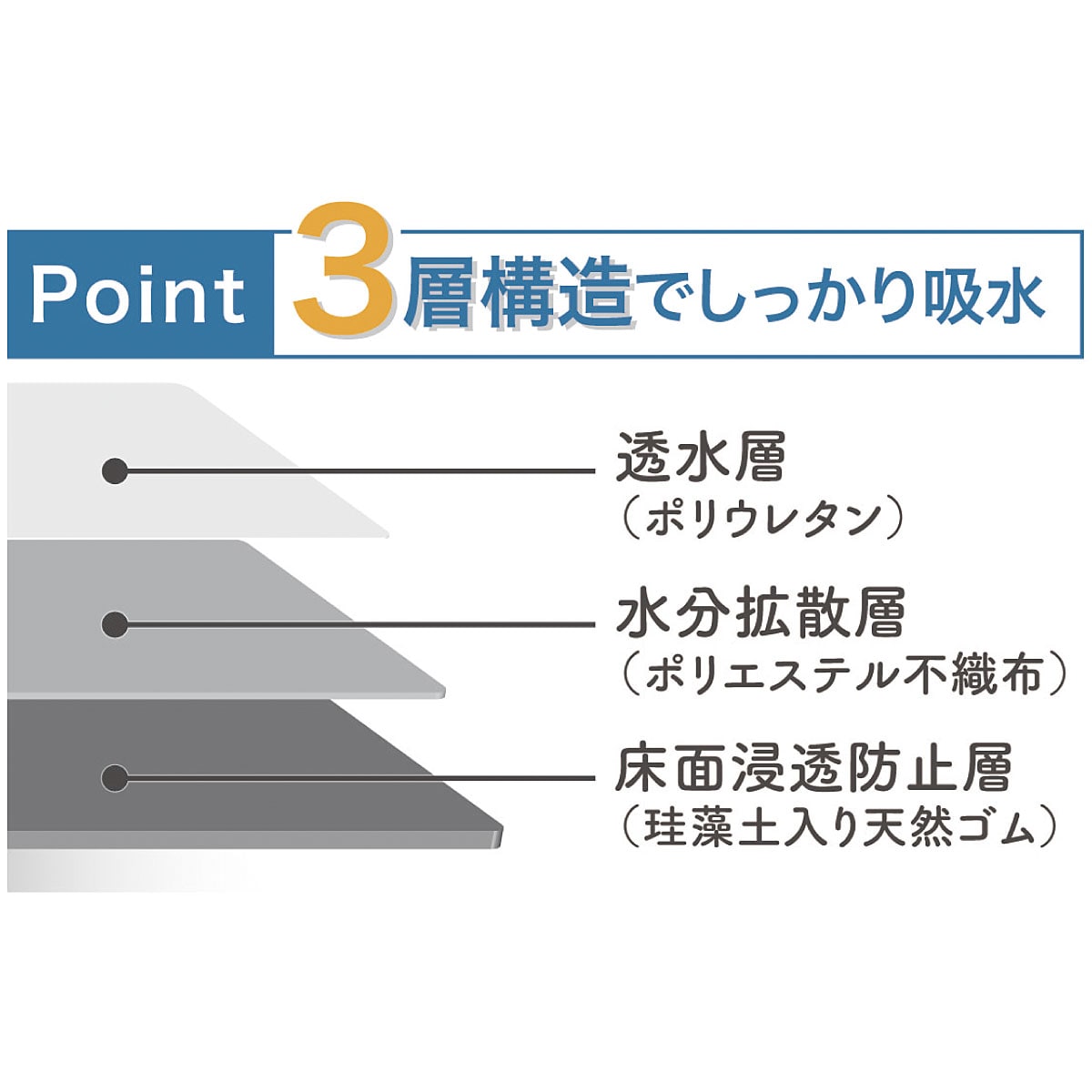 ■珪藻土入り天然ゴム・ポリエステル・ポリウレタン ■厚み/約7mm ●裏面にすべりにくい加工 ●アスベスト検査合格品●洗濯不可●中国製【抗菌防臭】▼床面の凹凸や使用状況により、すべりにくい効果に差が生じます。▼床材への付着及び床材の変色を防ぐため、1週間に1度床面を拭いてください。▼床面のワックス等が乾ききってからご使用ください。▼床暖房のある場所でのご使用はお避けください。