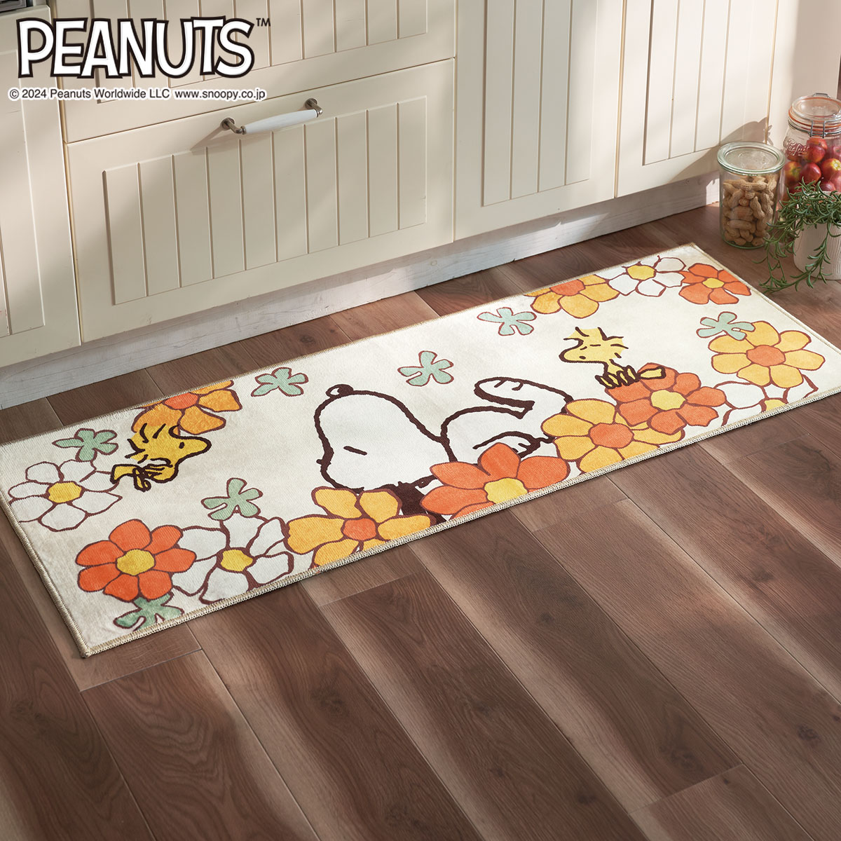 お花の上で眠るスヌーピーがかわいいキッチンマットです。毛足の短いなめらかな肌ざわりで、足元から心地よく。裏面にはすべりにくい加工でズレにくく、掃除機がけもラクラクです。大人かわいいポップなデザインで、キッチンを明るくしたい方におすすめ。ご家庭の洗濯機で丸洗いできるので、いつも清潔にお使いいただけます。