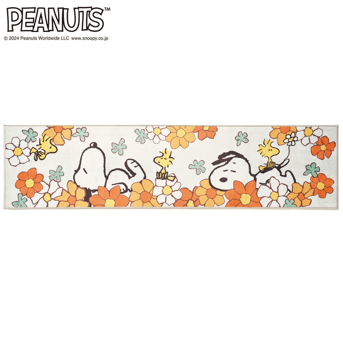 オレンジ(横120×縦45cm)洗い物だって楽しくなる! 花いっぱいのスヌーピー キッチンマットです。
