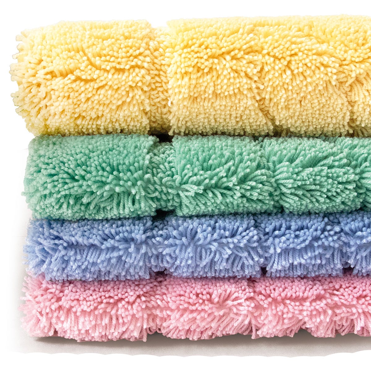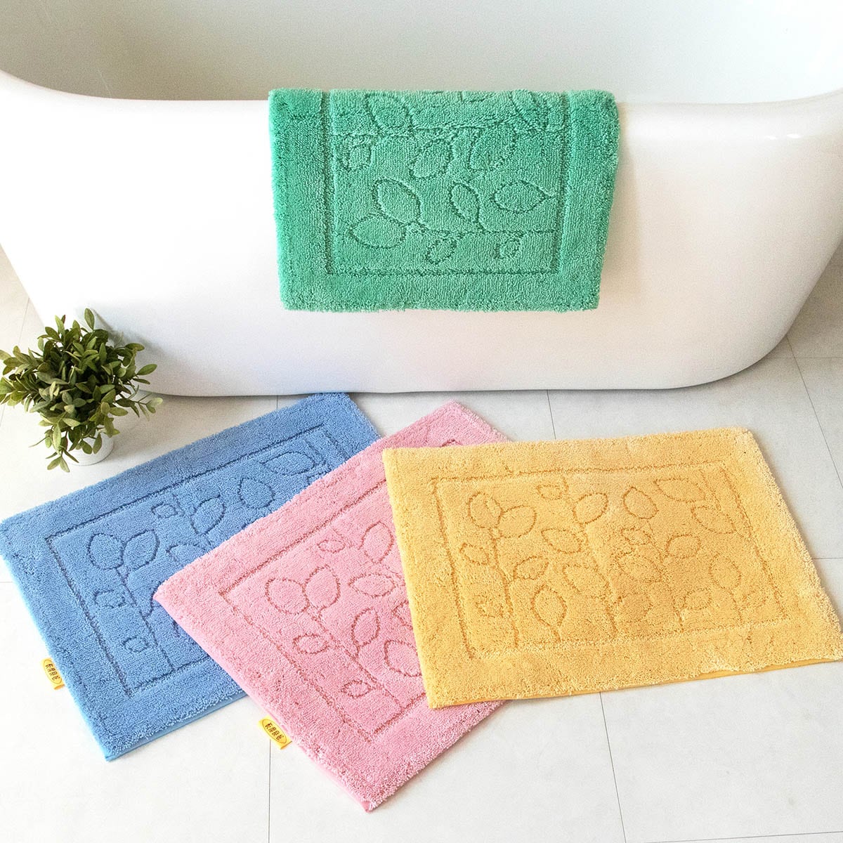 (上から時計周りに)グリーン・イエロー・ピンク・ブルー触れた瞬間1秒吸水! 乾度良好®バスマットです。
