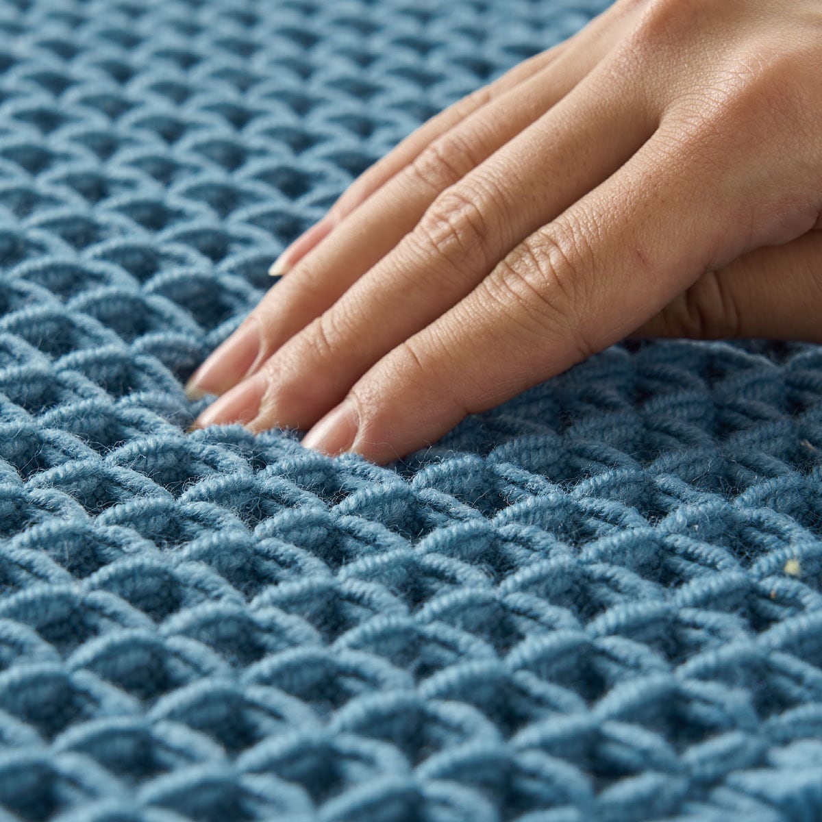 密度が高く凹凸感のあるワッフル織りで、もっちりしているのにベタつかない。抗菌防臭加工付きでいつも清潔に保てます。洗濯機で洗えて、お手入れ簡単なのも嬉しいポイント。