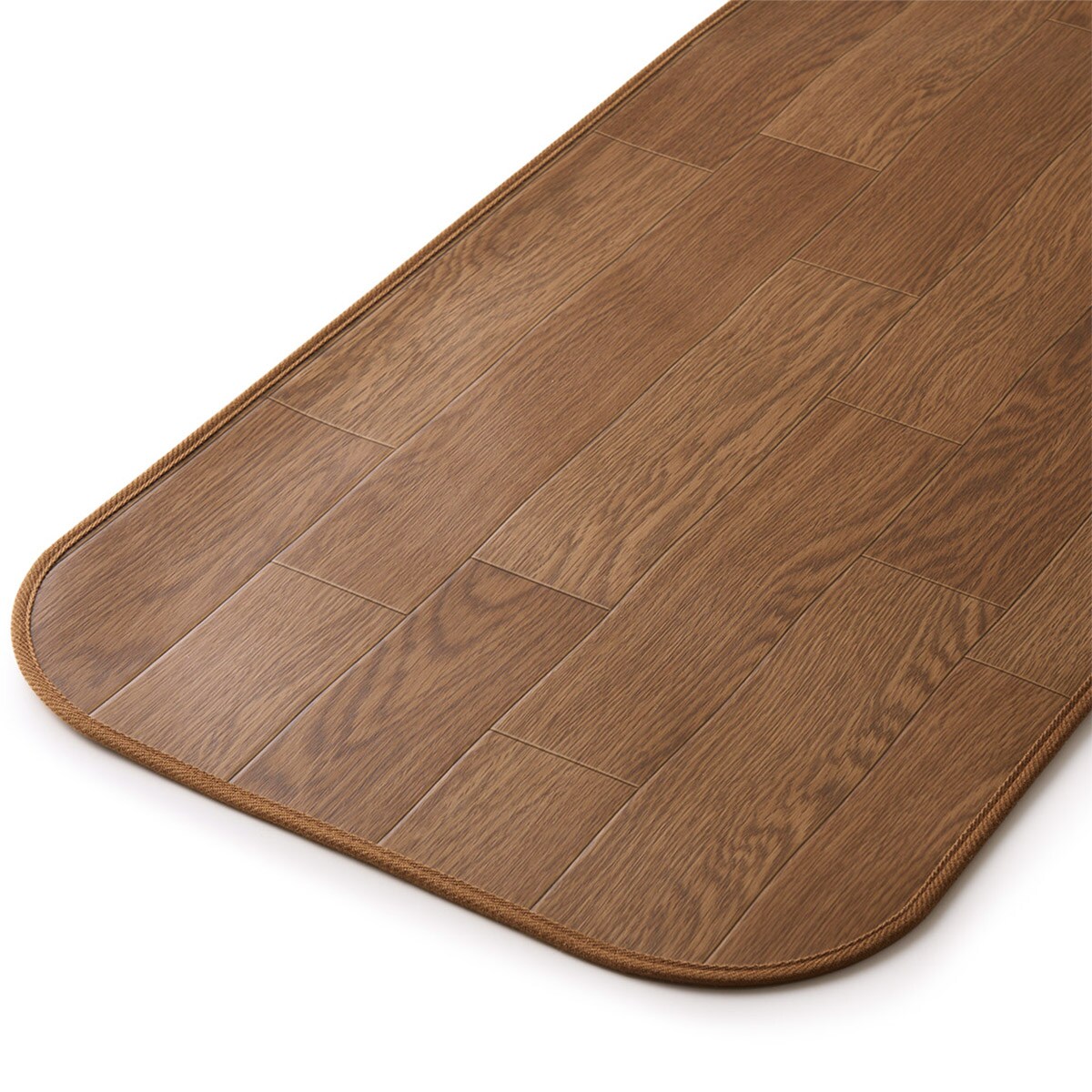 抗菌・防カビ機能を備えたキッチンマットです。水ハネや油汚れも染み込まないからお手入れ簡単。サッと拭くだけで、床面をいつも清潔に保てます。厚さ約5mmでキッチンの引き出しの開閉にも引っ掛かりません。裏面はすべりにくい加工でズレにくく、掃除機もスムーズにかけられます。暮らしに馴染むナチュラルな木目調と無地調、アクセントになるタイル柄をご用意しました。折りじわのできない巻いた状態でお届けします。