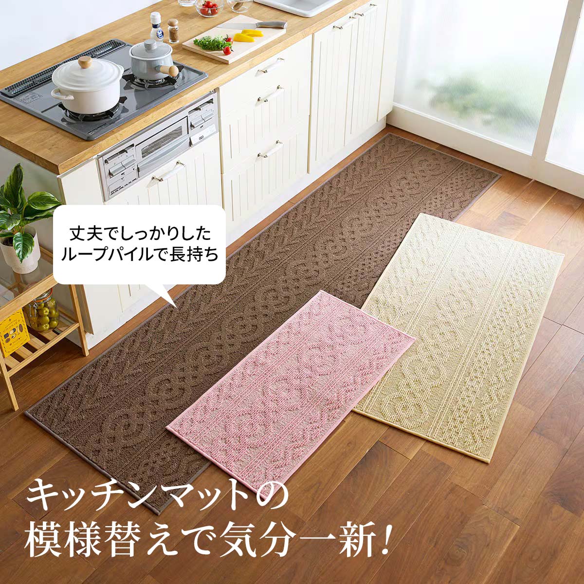 かわいいニット柄が空間をおしゃれに演出する、ピタッとズレにくいキッチンマットです。高密度なループパイルで踏み心地もしっかり&長持ち!