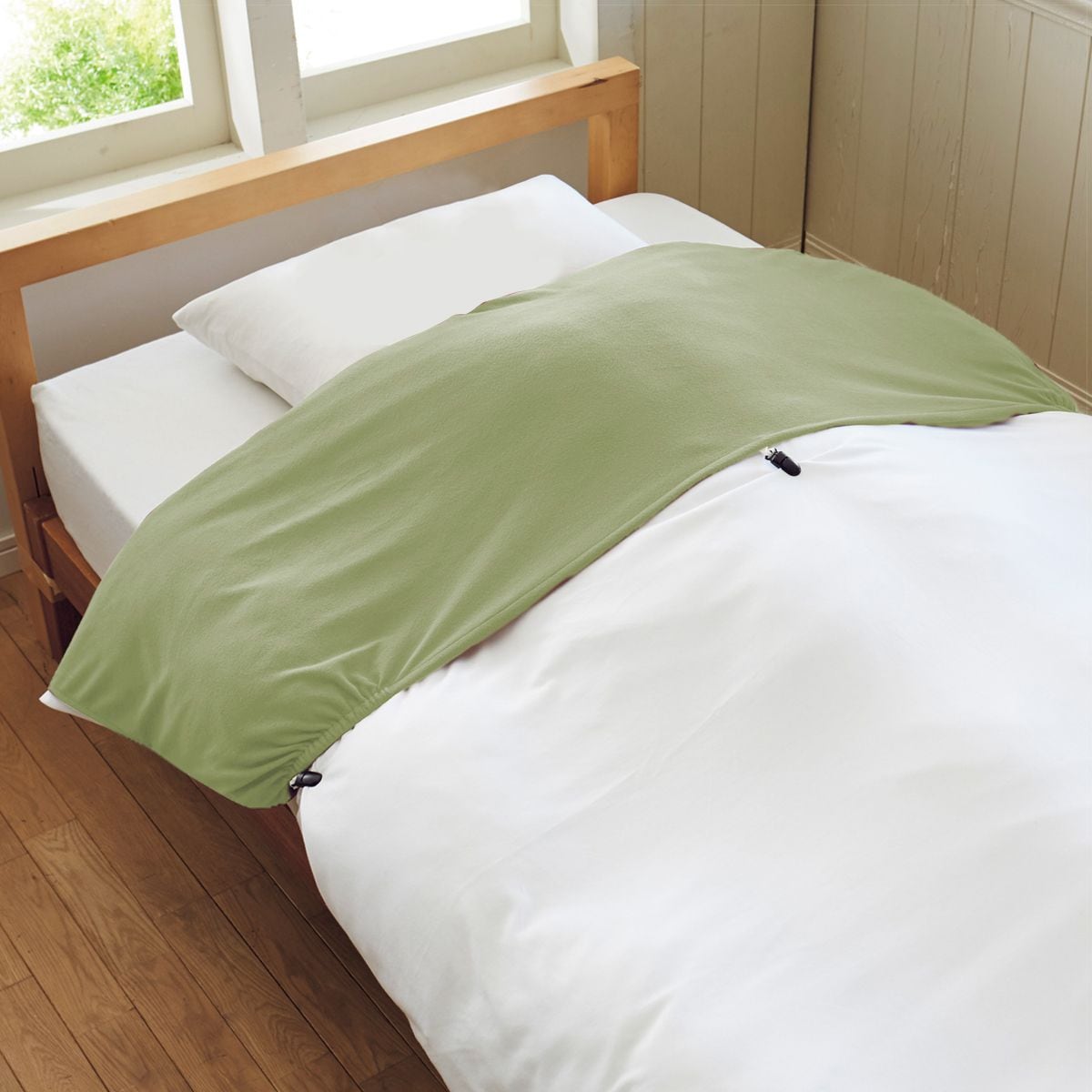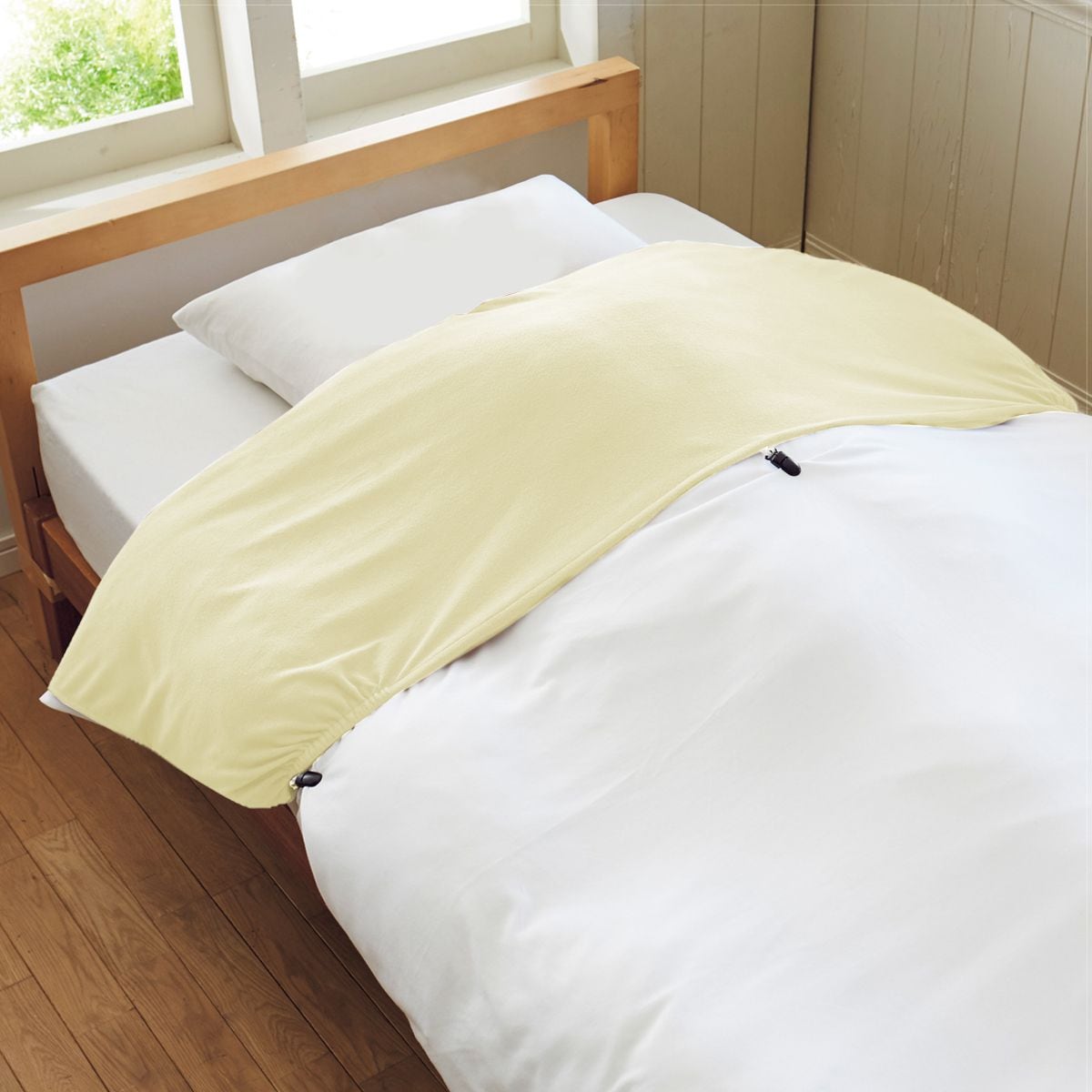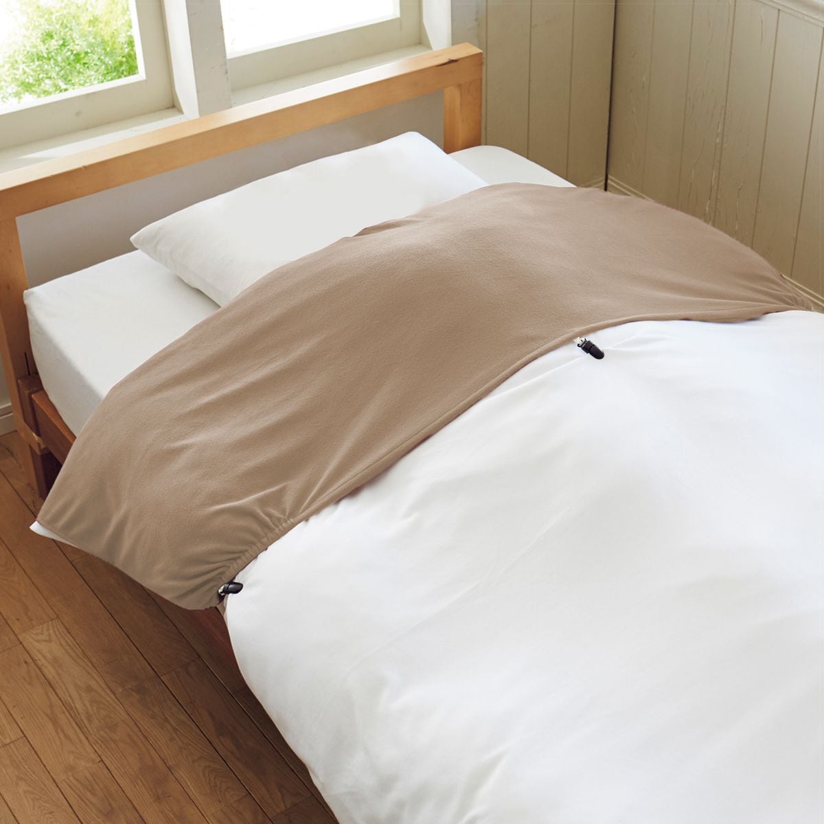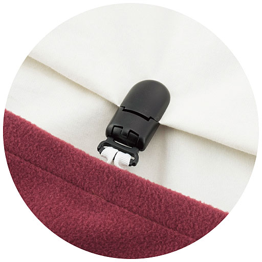 掛け布団の衿部分にかぶせて3ヶ所のズレ防止用クリップを留めるだけで、簡単にセットできます。