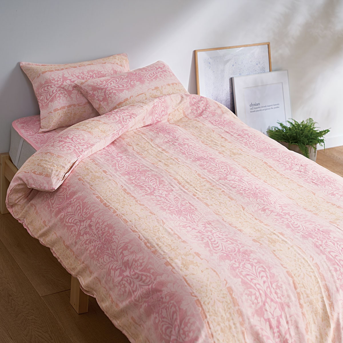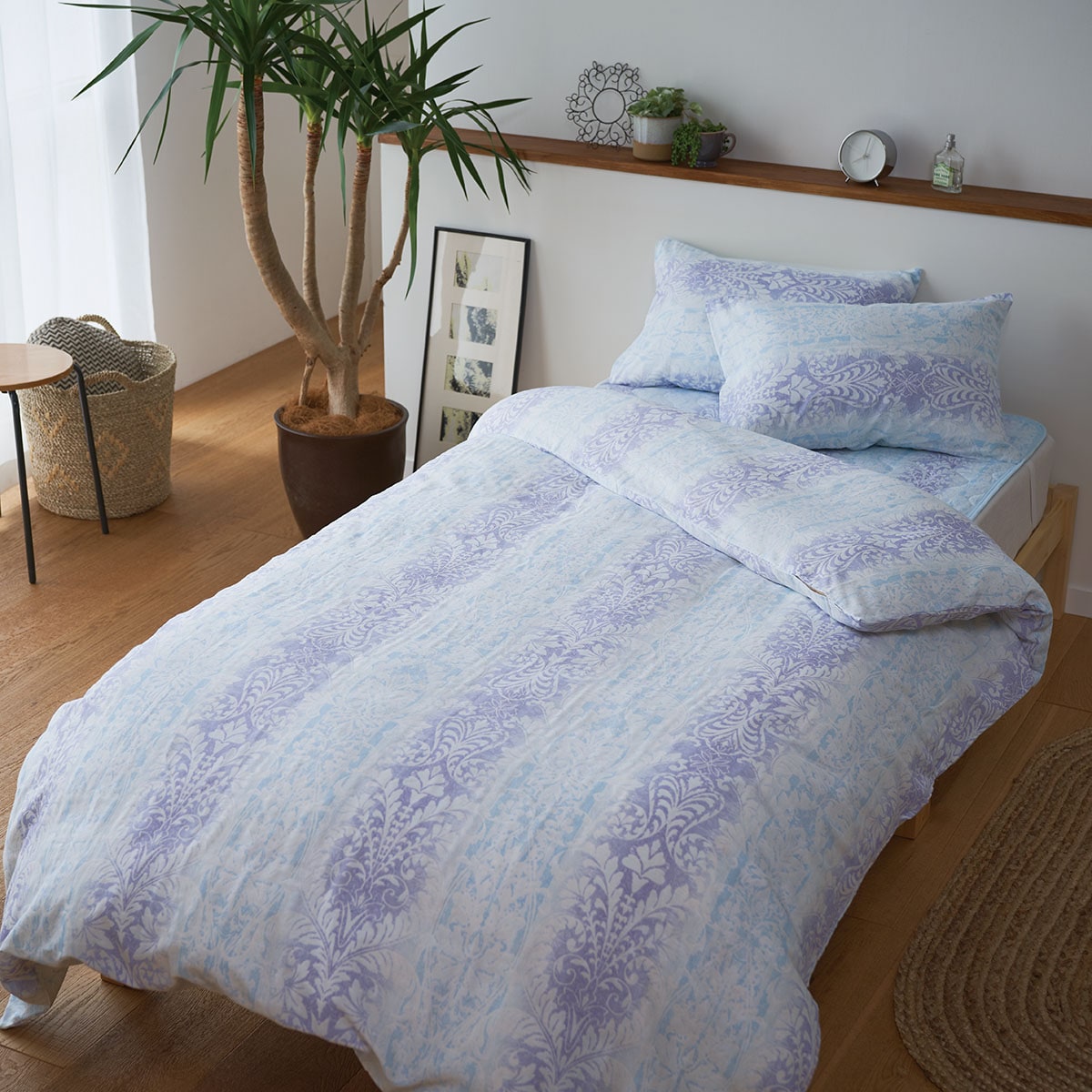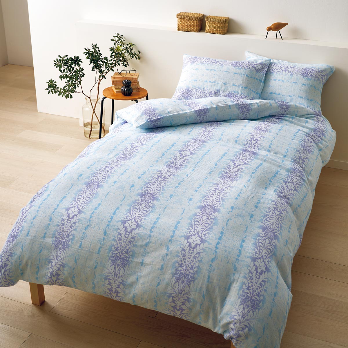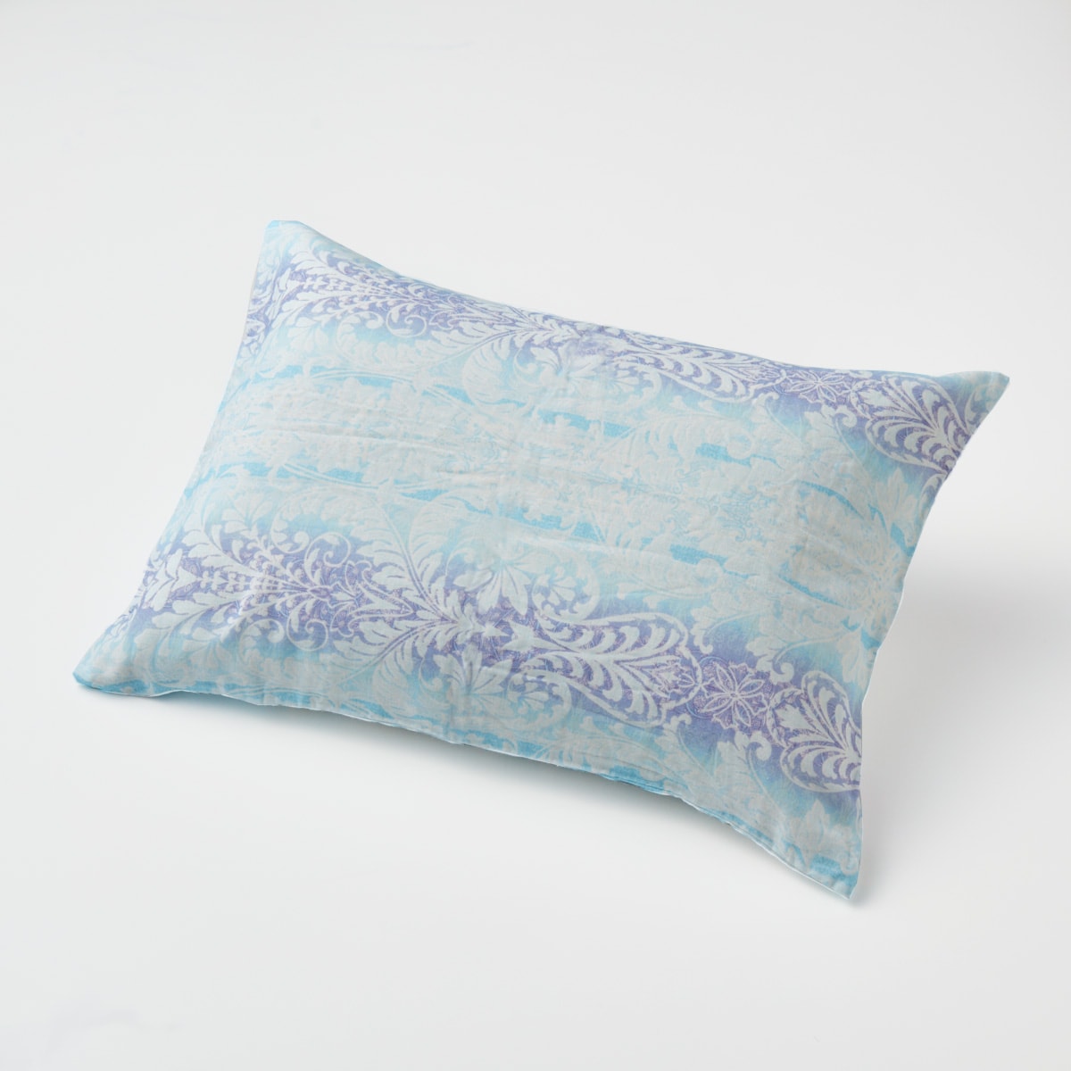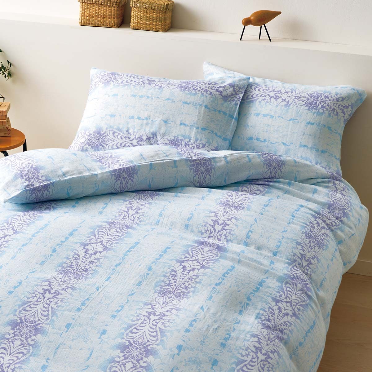 軽やかですーっと風を通す、ダブルガーゼの枕カバーです。汗をかいてもベタつかず気持ちのいい肌ざわり。やさしい色合いに心落ち着くダマスク柄も魅力です。