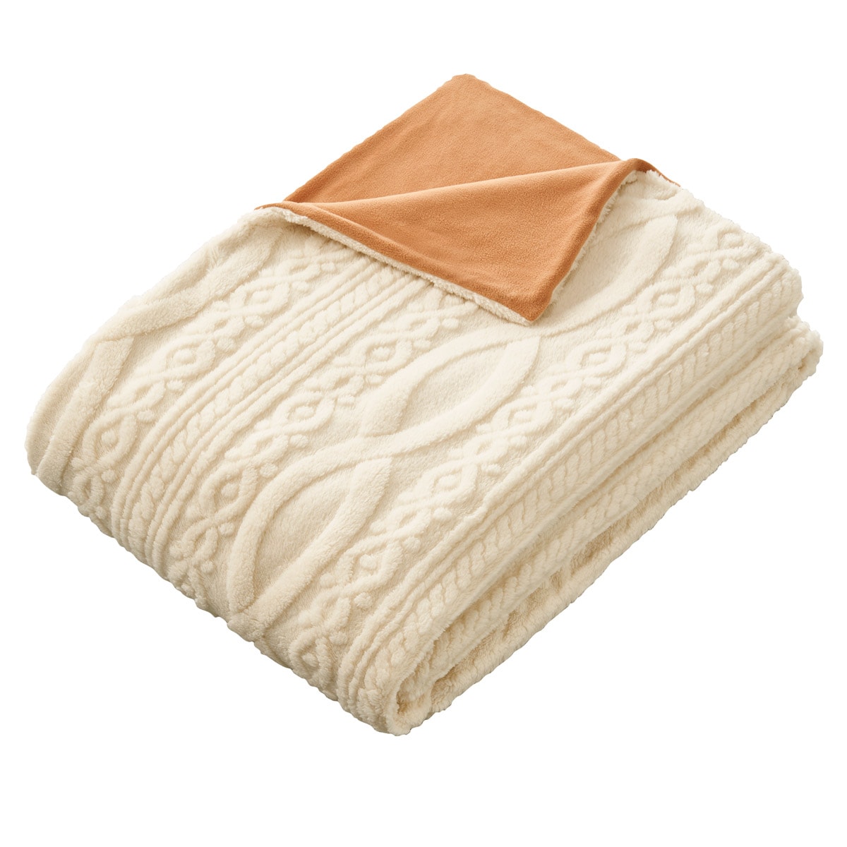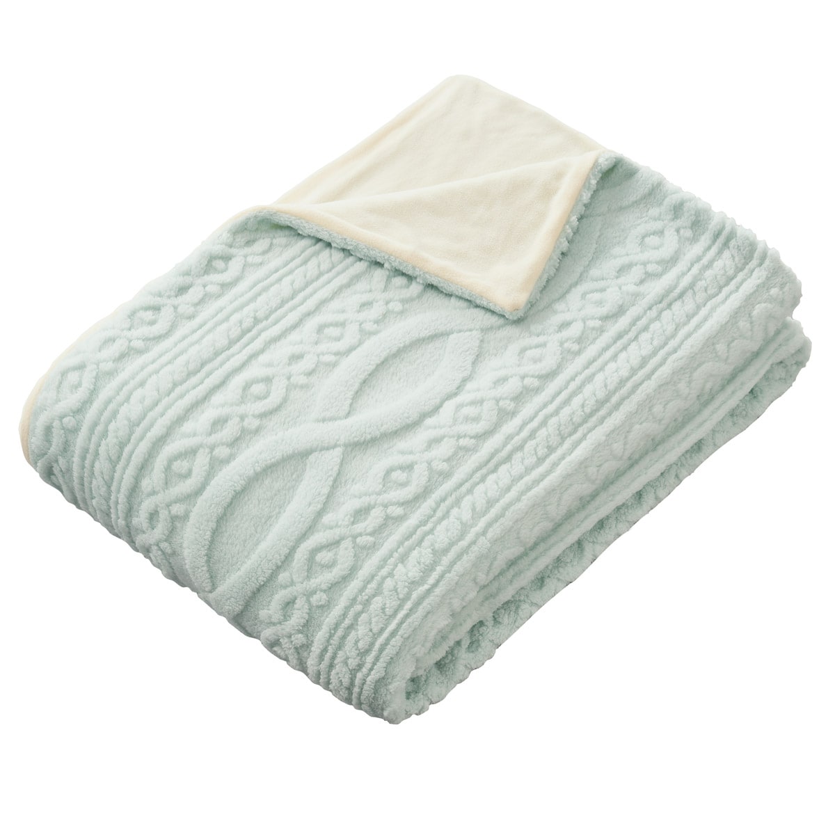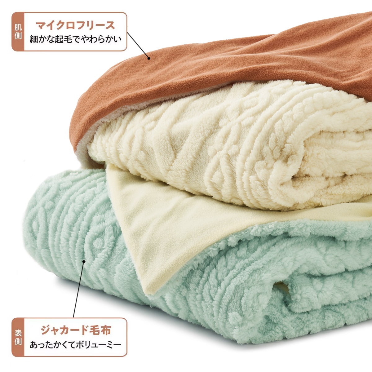 (上から) アイボリー・ブルー表側はあったかジャカード毛布生地、裏側はなめらかなマイクロフリース生地を使用。