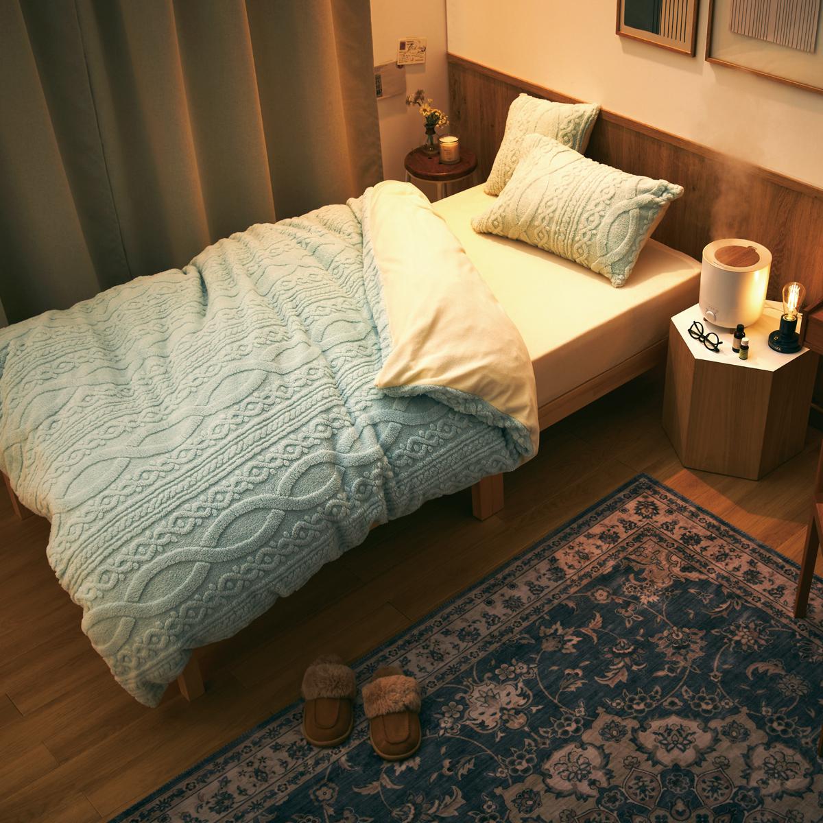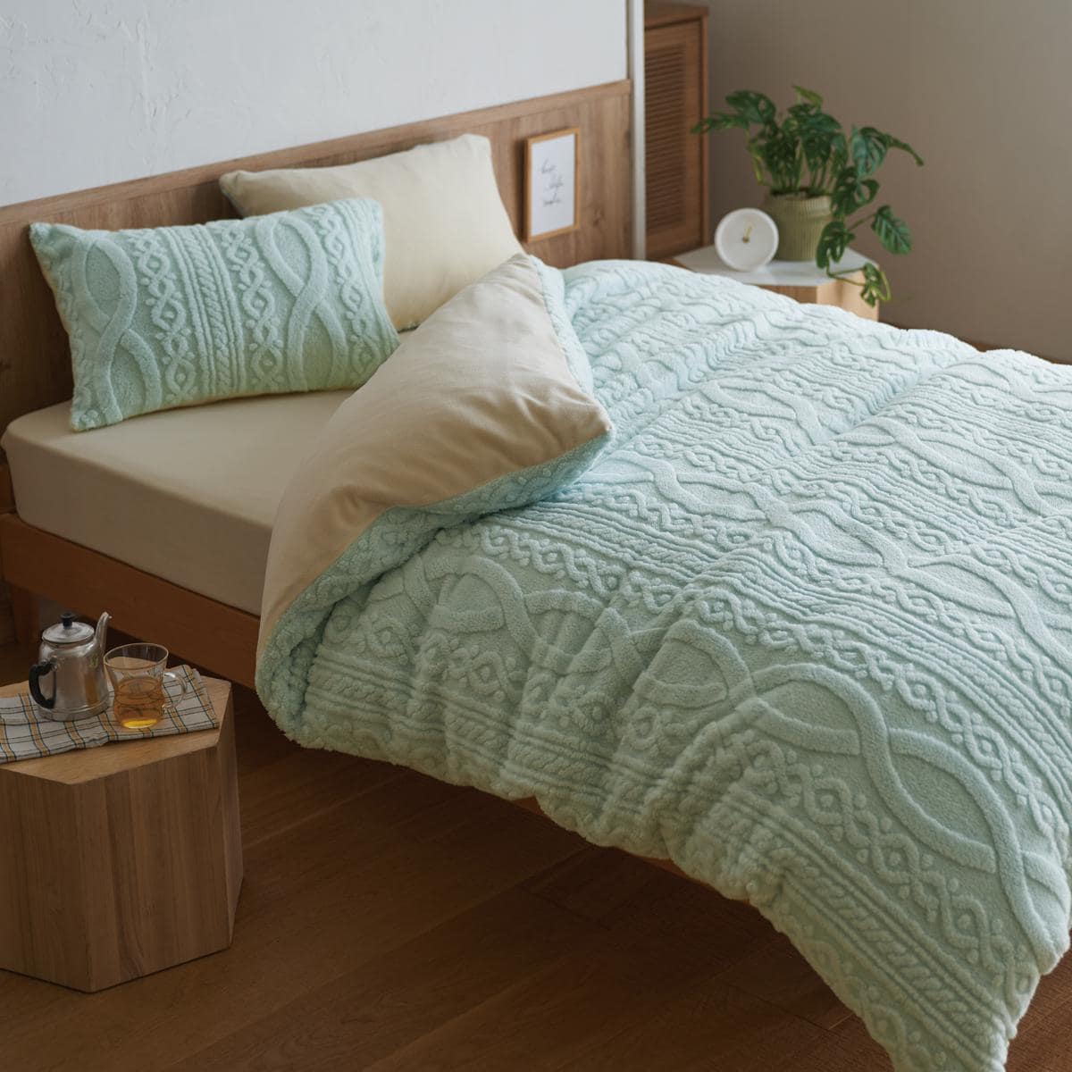 ぬくもりが寄り添うふわモコカバーで、心も体もほっこり。ニット柄がかわいいあったか掛け布団カバーです。寝室をおしゃれな北欧風にコーディネート。