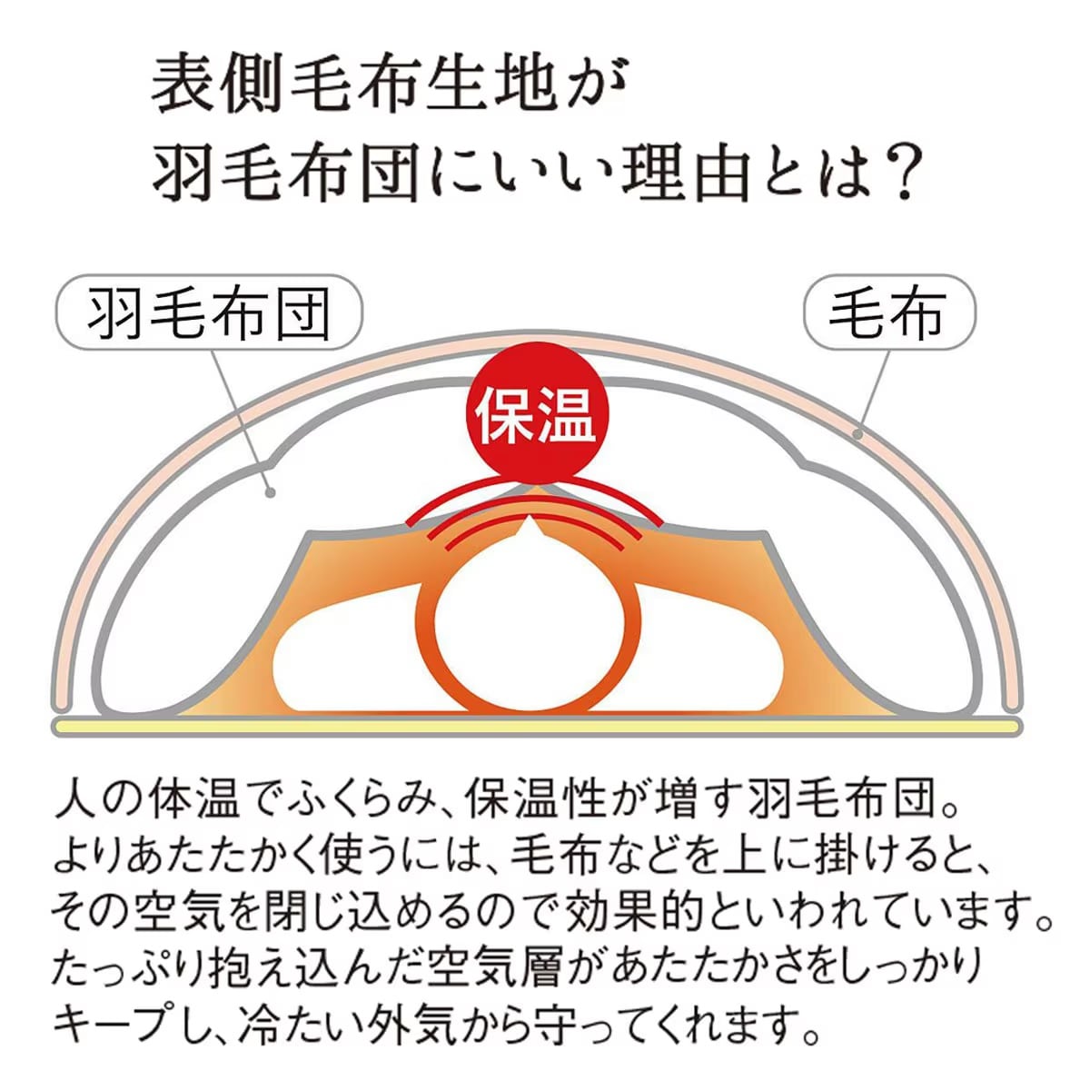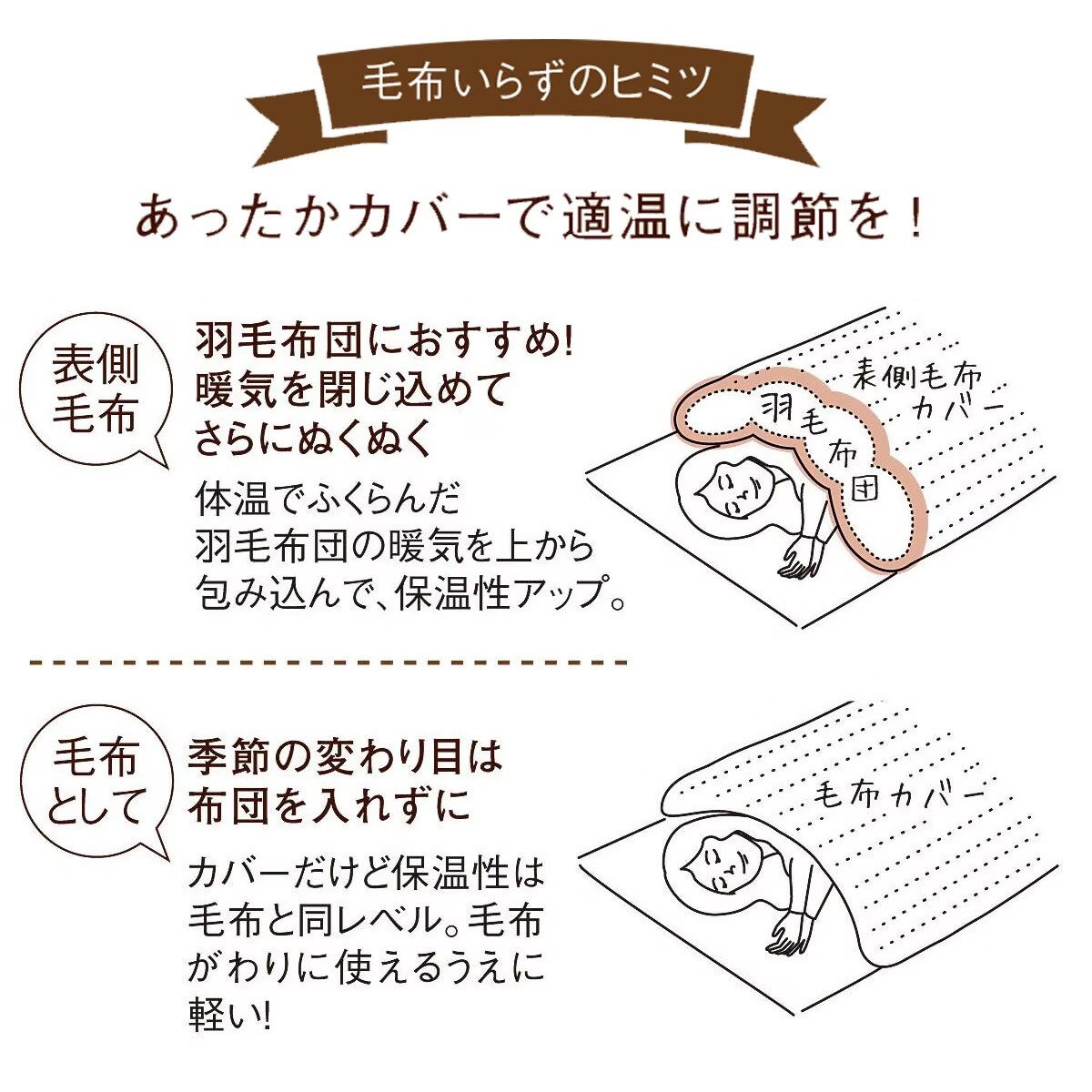 表側毛布生地のカバーは羽毛布団におすすめ! 暖気を閉じ込めてさらにぬくぬく。布団を入れずに毛布としても使用できます。