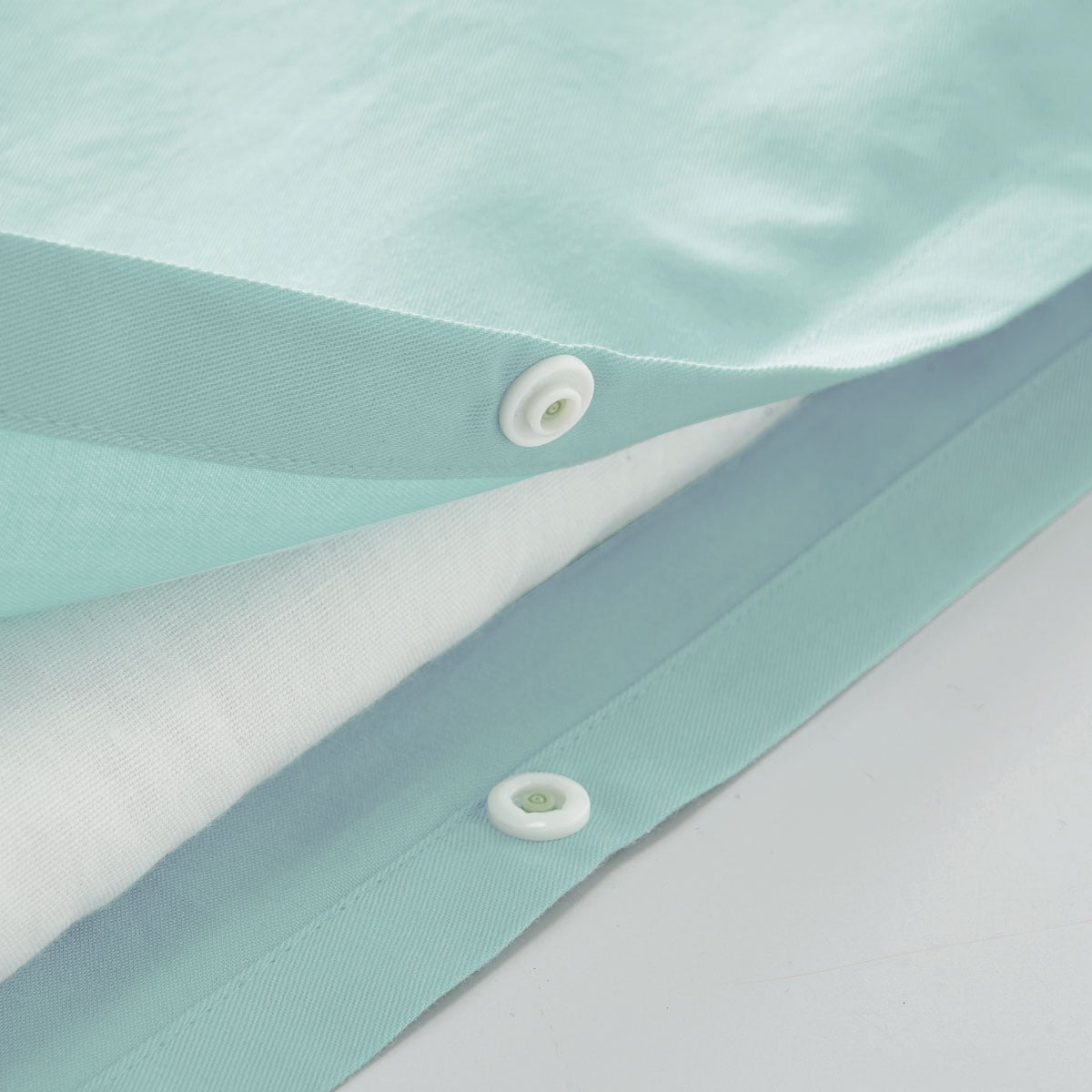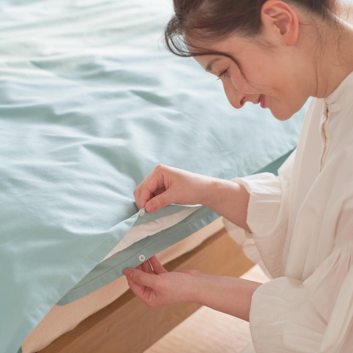 当社オリジナルの新しい着脱方法。スナップボタン採用で面倒な紐結び不要。布団カバーの交換が重労働だと感じる方におすすめ!