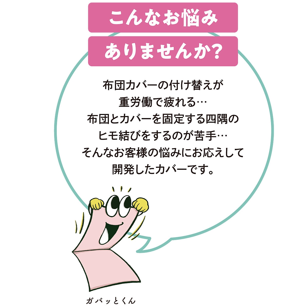 ガバッと開く新方式! 面倒なカバーの交換がとっても簡単にできる掛け布団カバーです。カバーをこまめに洗いたい、カバーの交換が重労働だと感じる方におすすめです。