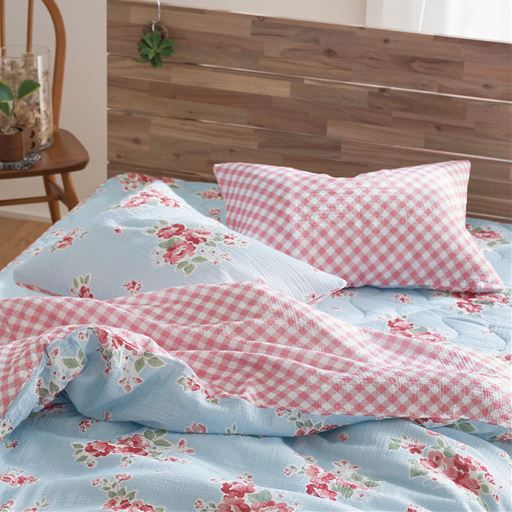 サックス系(ピンクギンガムチェック) ※商品は枕カバーです。花柄×チェック柄の両面柄違いでお部屋をパッと明るい雰囲気に。