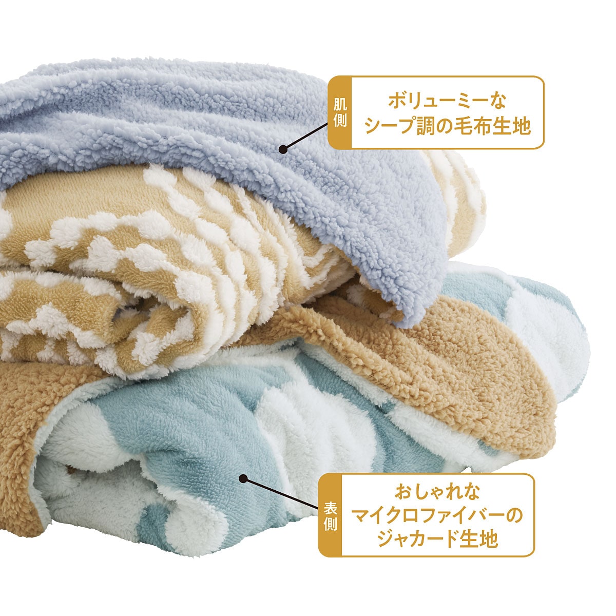 肌側はシープ調の毛布生地、表側にはマイクロファイバーのジャカード生地を使用。
