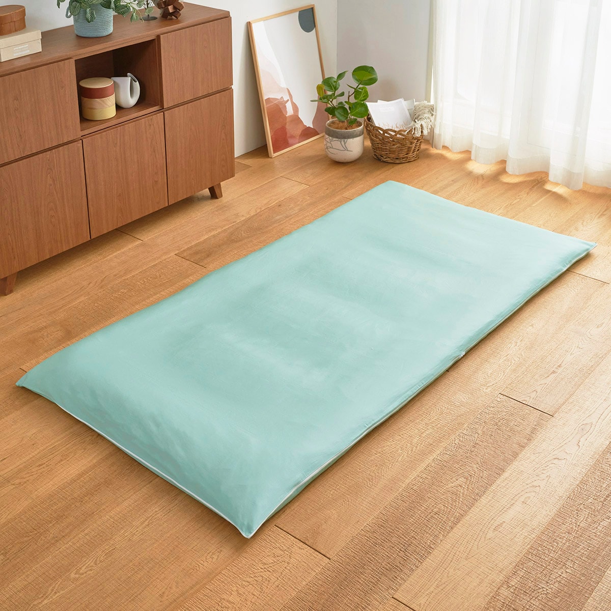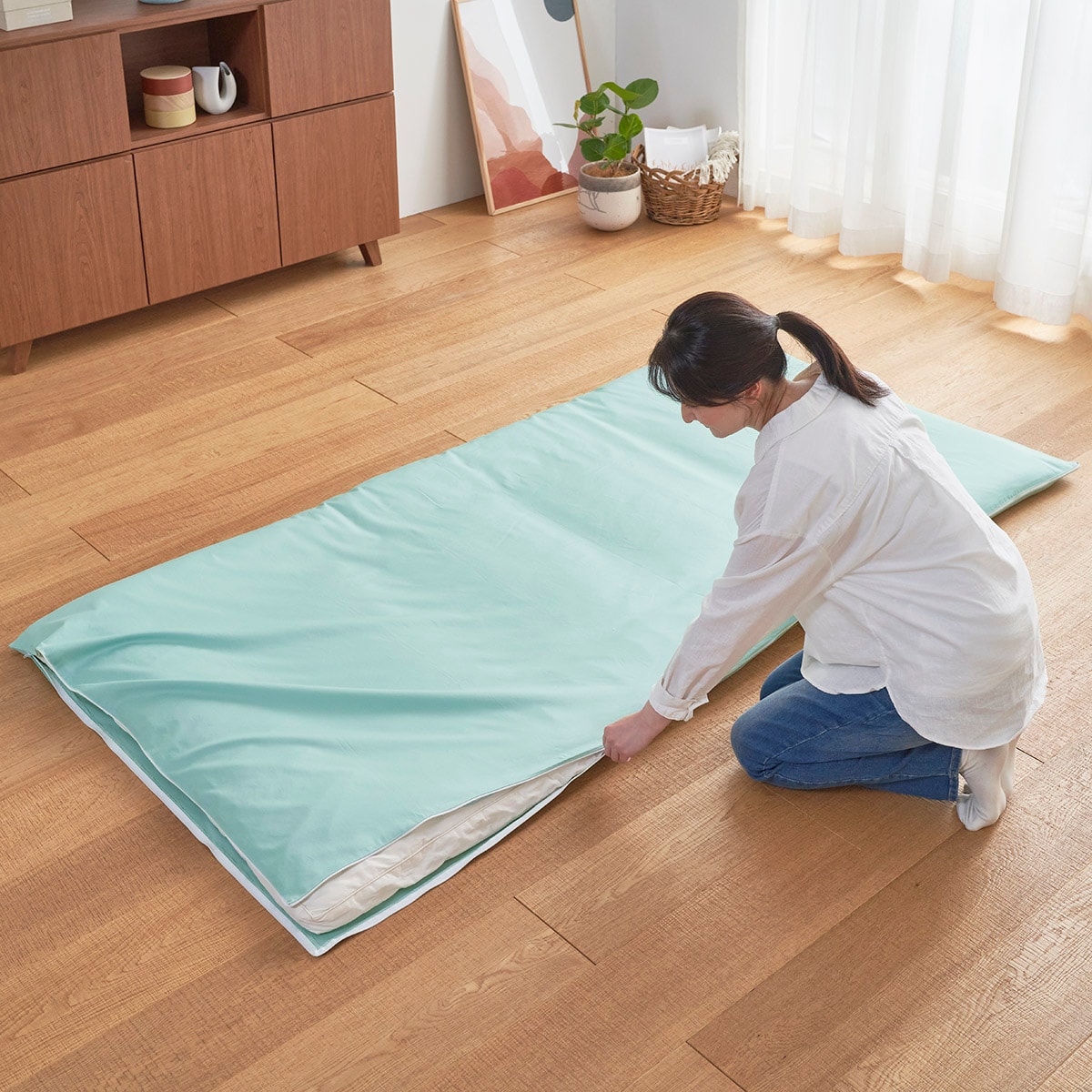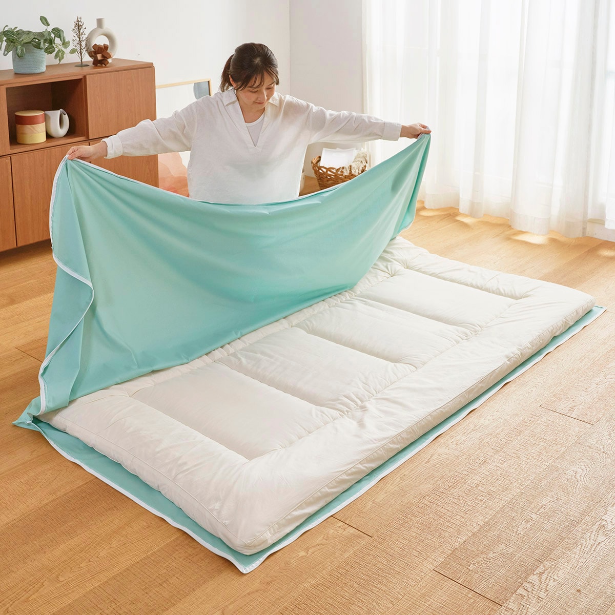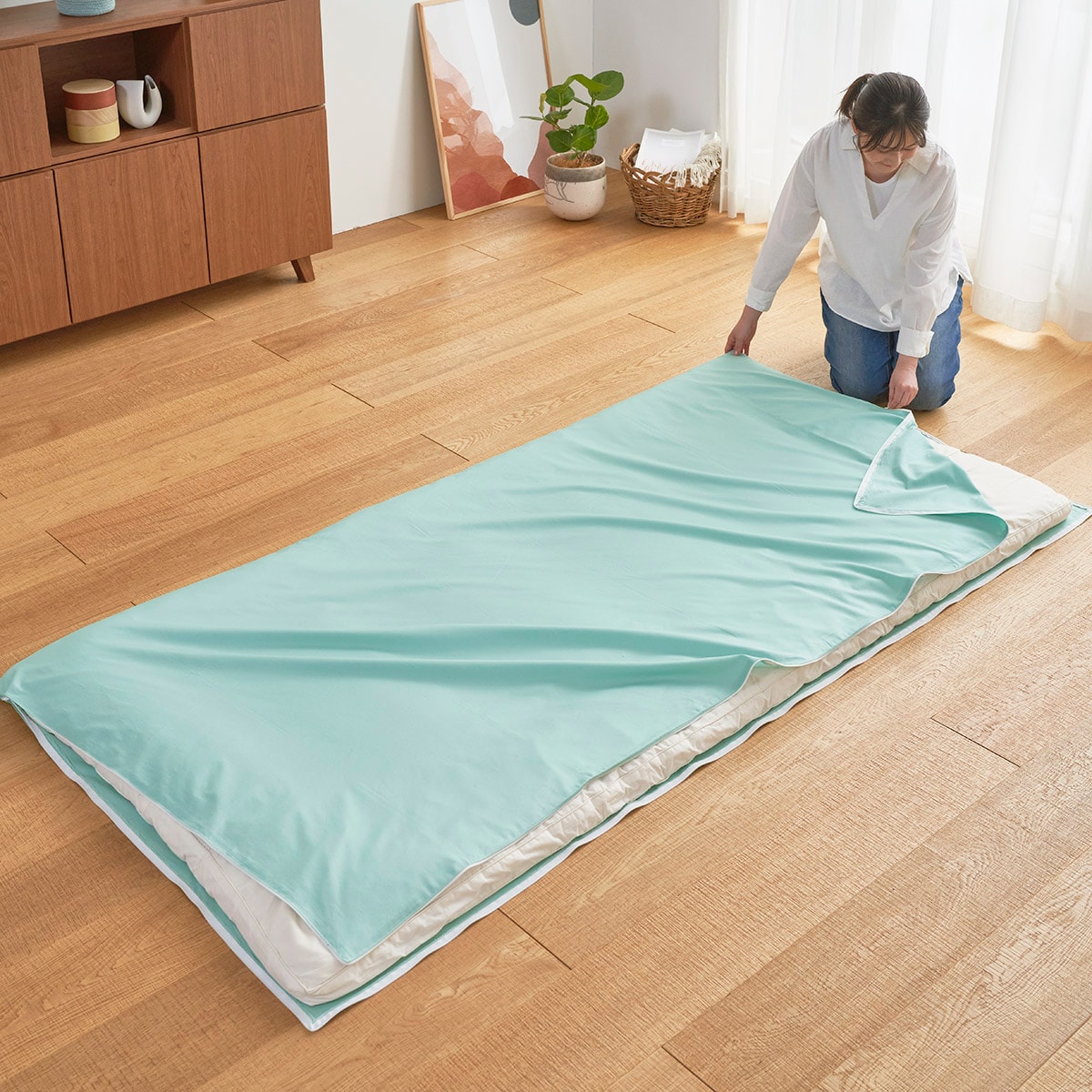 アンティックグリーンカバーを開きその上に敷き布団を載せ、カバーをかぶせます。