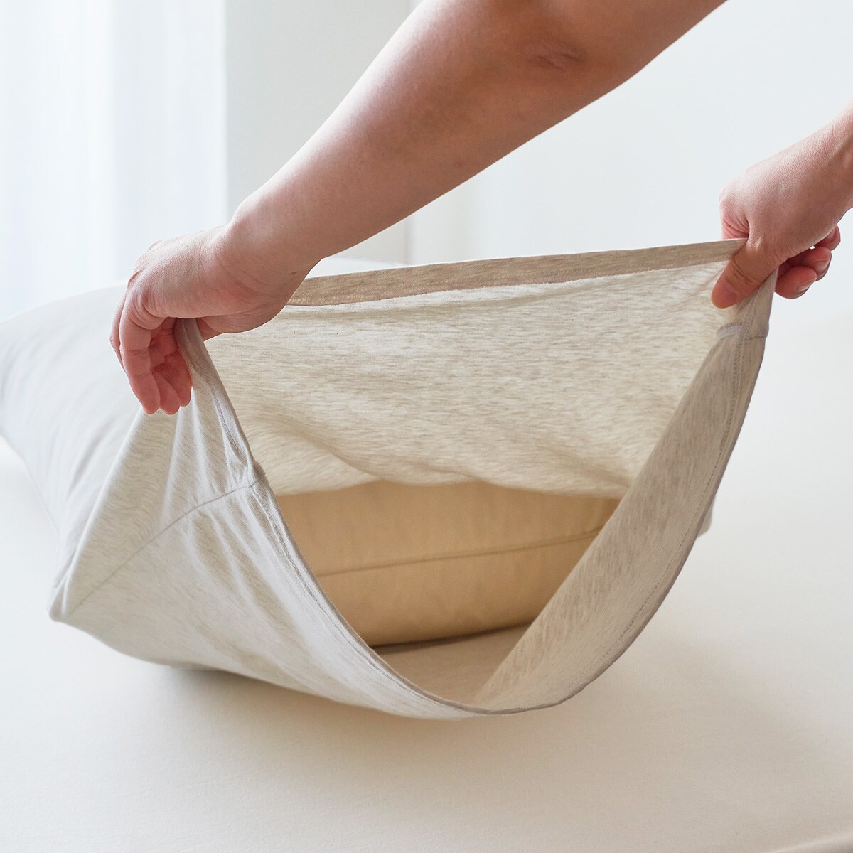 肌にやさしく寄り添う、綿100%天竺ニットの枕カバーです。伸縮性の高い天竺ニットはやわらかくて肌になじむから快適。Tシャツや肌着にも使われる生地だから、こすれてもガサガサとした嫌な音がしないので心地よく眠れます。枕カバーは封筒式なので、余った部分を折り込んでサイズ調整が可能。ご家庭の洗濯機で気軽に洗えるので、清潔にお使いいただけます。