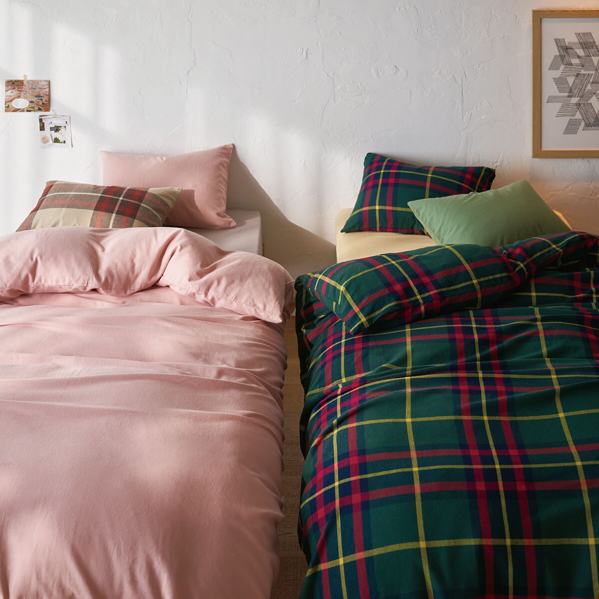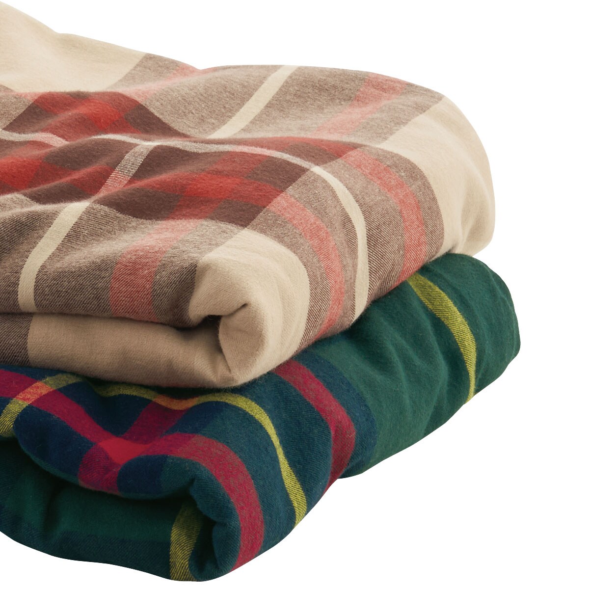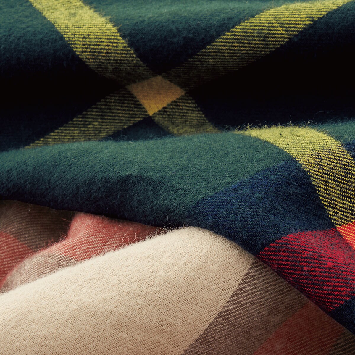 (上から) ダークグリーン・ベージュ起毛したネルのやさしい肌ざわり。