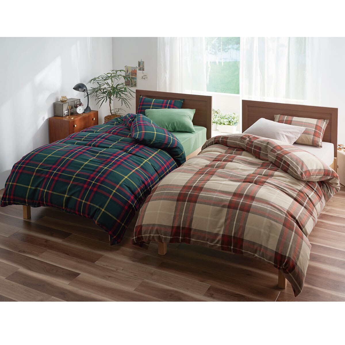 (左から)ダークグリーン・ベージュ ※商品は掛け布団カバーですやわらかな綿100%ネル素材で気持ちもほっこり。