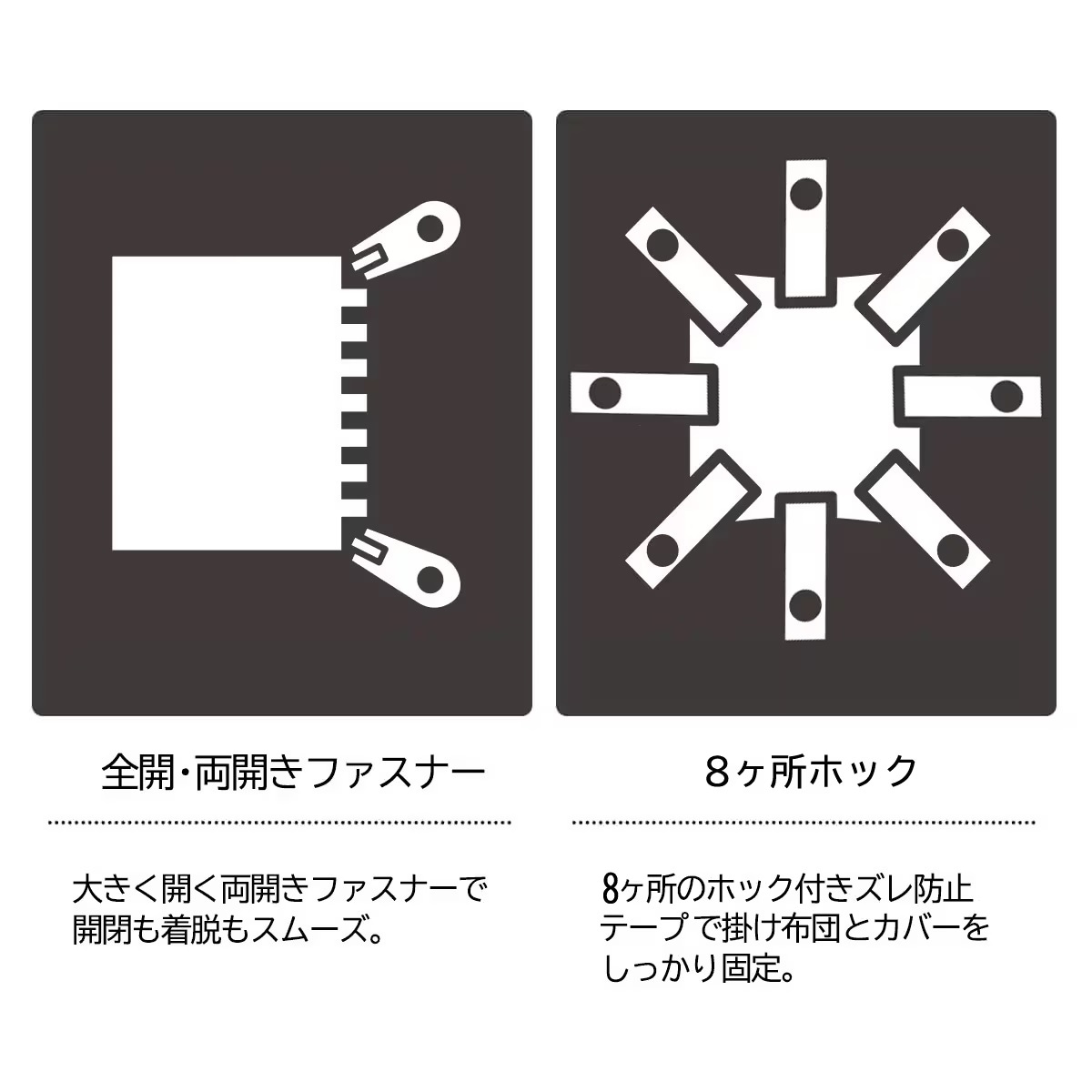 オールシーズン使えるから片付けなくてOKな2WAY掛け布団カバーです。側生地に綿100%の天竺ニット素材、中わたには抗菌防臭わたを使用しました。快適な肌ざわりで夏は肌掛け布団として1枚で気持ち良く、冬はお手持ちの布団を入れてあたたかな布団カバーとしてお使いいただけます。内側にある8ヶ所のホックで掛け布団とカバーをしっかり固定。全開・両開きファスナーで開閉も着脱もスムーズです。「寝具の収納場所が無い…」とお困りのあなたへおすすめの商品です。