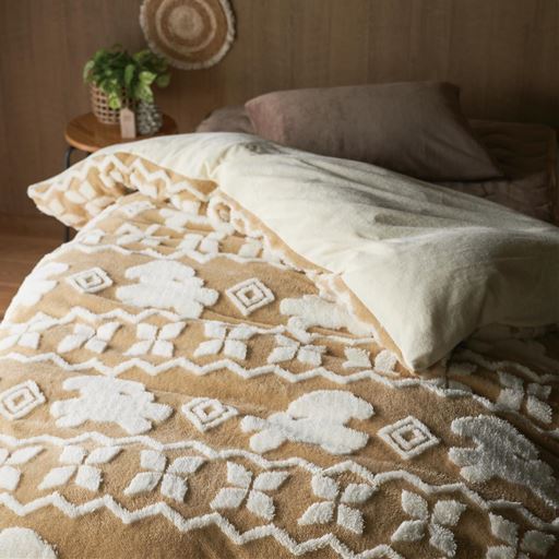 肌側綿100%ベロアで表側がボリューム感のあるジャカード毛布で布団に入るときのヒヤッと感がなく軽くてあたたかい掛け布団カバー。内側に取り付けた8ヶ所のホックで掛け布団とカバーをしっかり固定。全開・両開きファスナーで開閉も着脱もスムーズです。