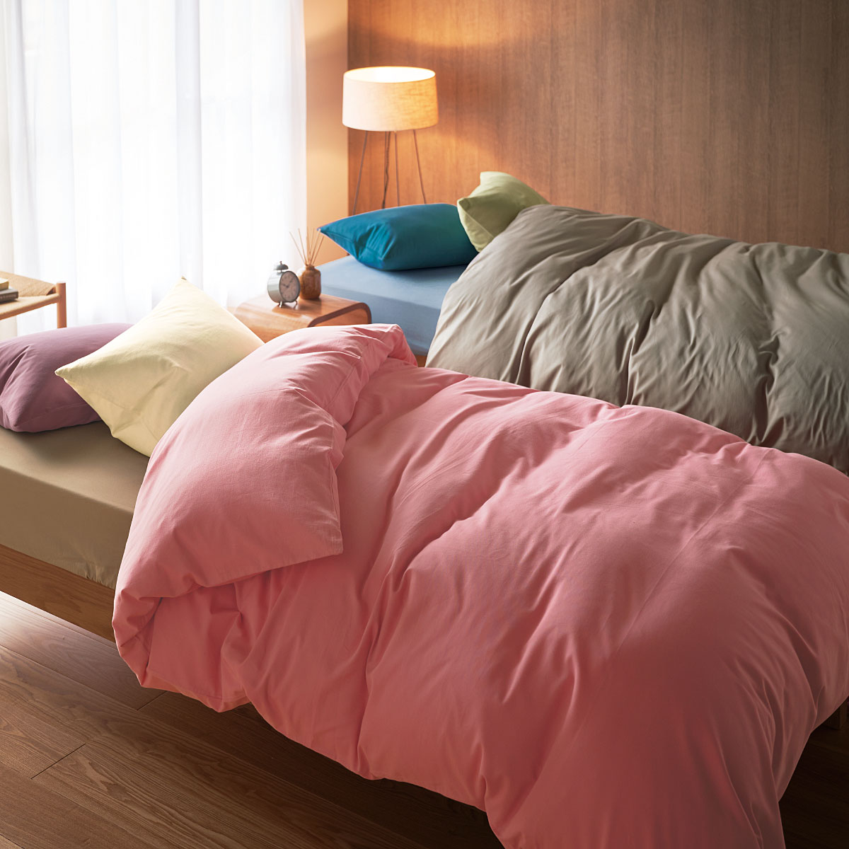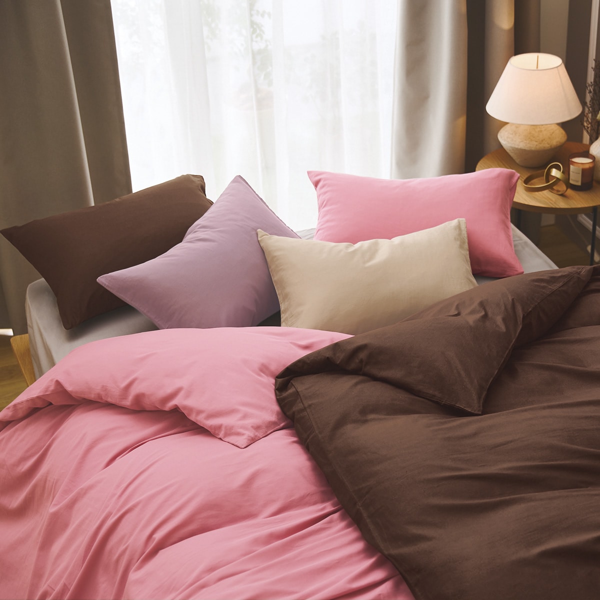 コーディネートイメージ ※商品は枕カバーです。(左から)コーヒーブラウン・ミスティラベンダー・オークベージュ・ローズピンク