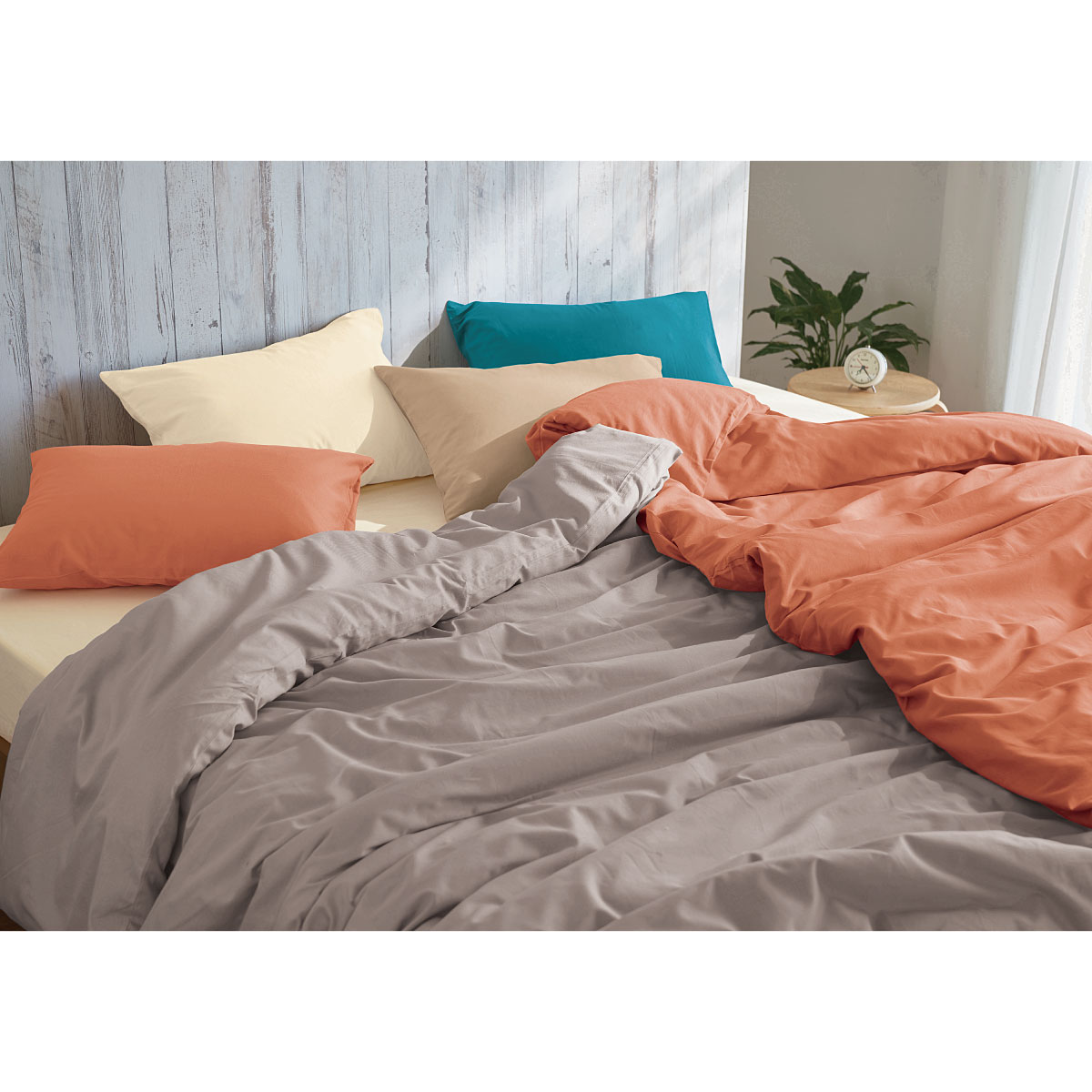 コーディネートイメージ ※商品は枕カバーです。(左から)アプリコット・アイボリホワイト・オークベージュ・ターコイズブルー