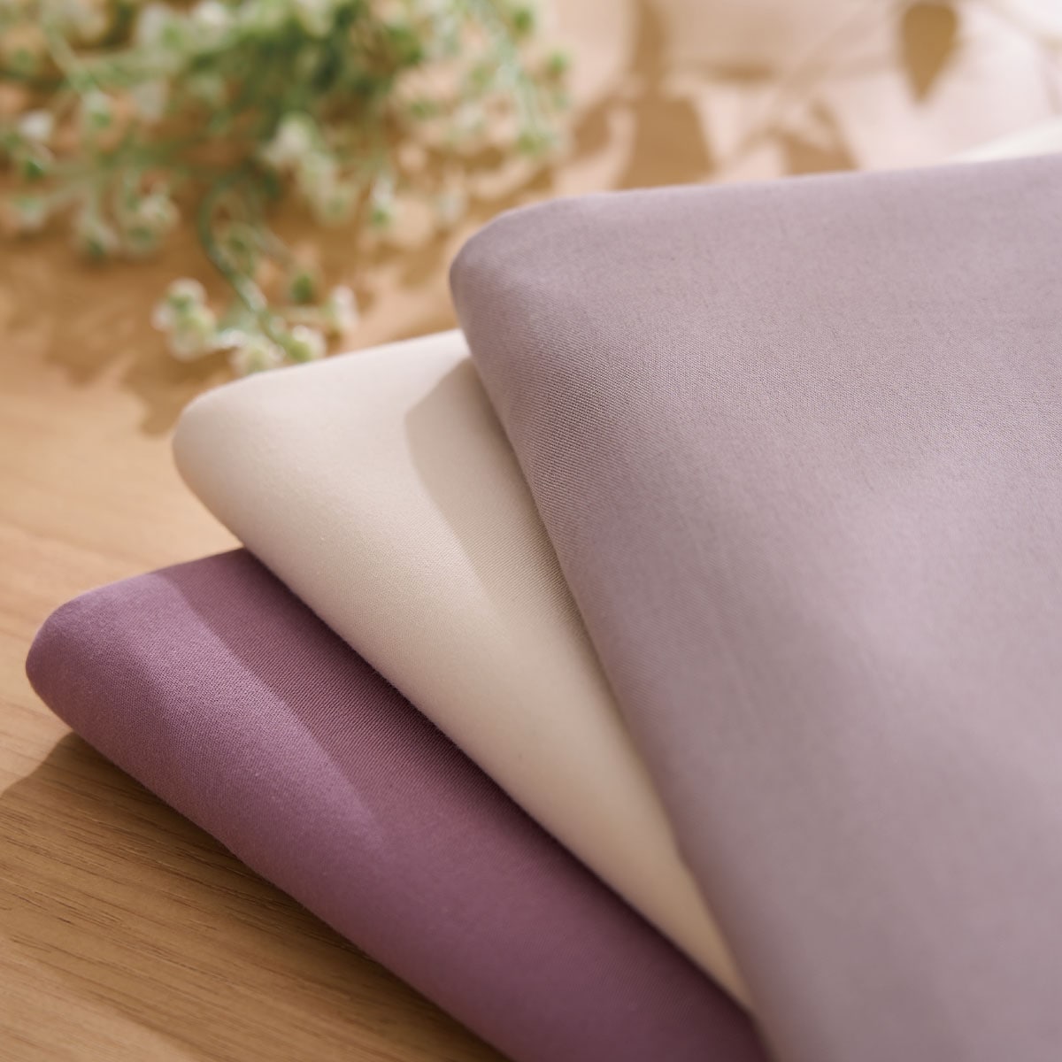 (上から) ミディアムグレー・アイボリホワイト・ミスティラベンダー豊富なカラーでコーディネートも自由自在。