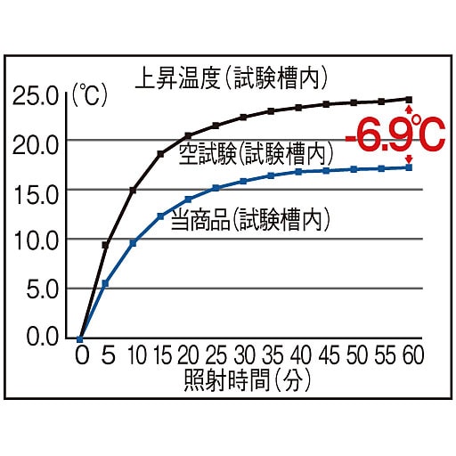 遮熱性試験(赤外ランプ 60℃法)においては、60分後の温度上昇を6.9℃抑えることができ、遮熱性効果も確認できています。