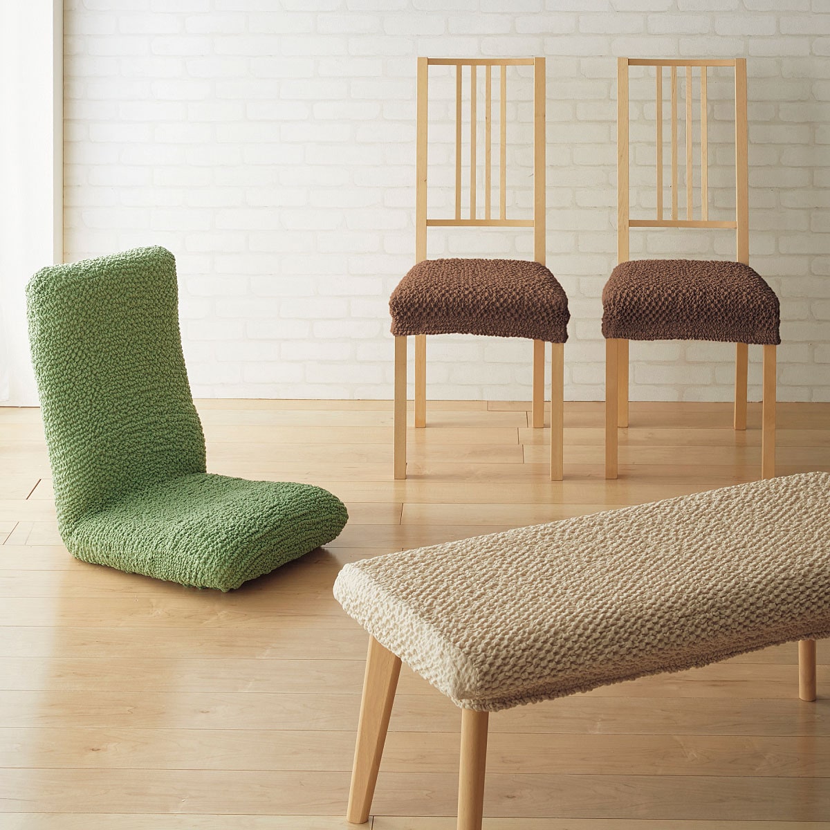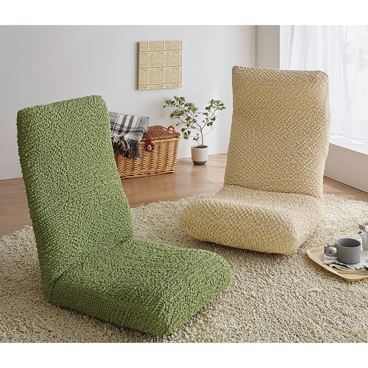 (左から) パウダーグリーン(座椅子カバーM)・アイボリー(座椅子カバーM)肉厚ジャカード生地を使用した、のびのび座椅子カバーです。