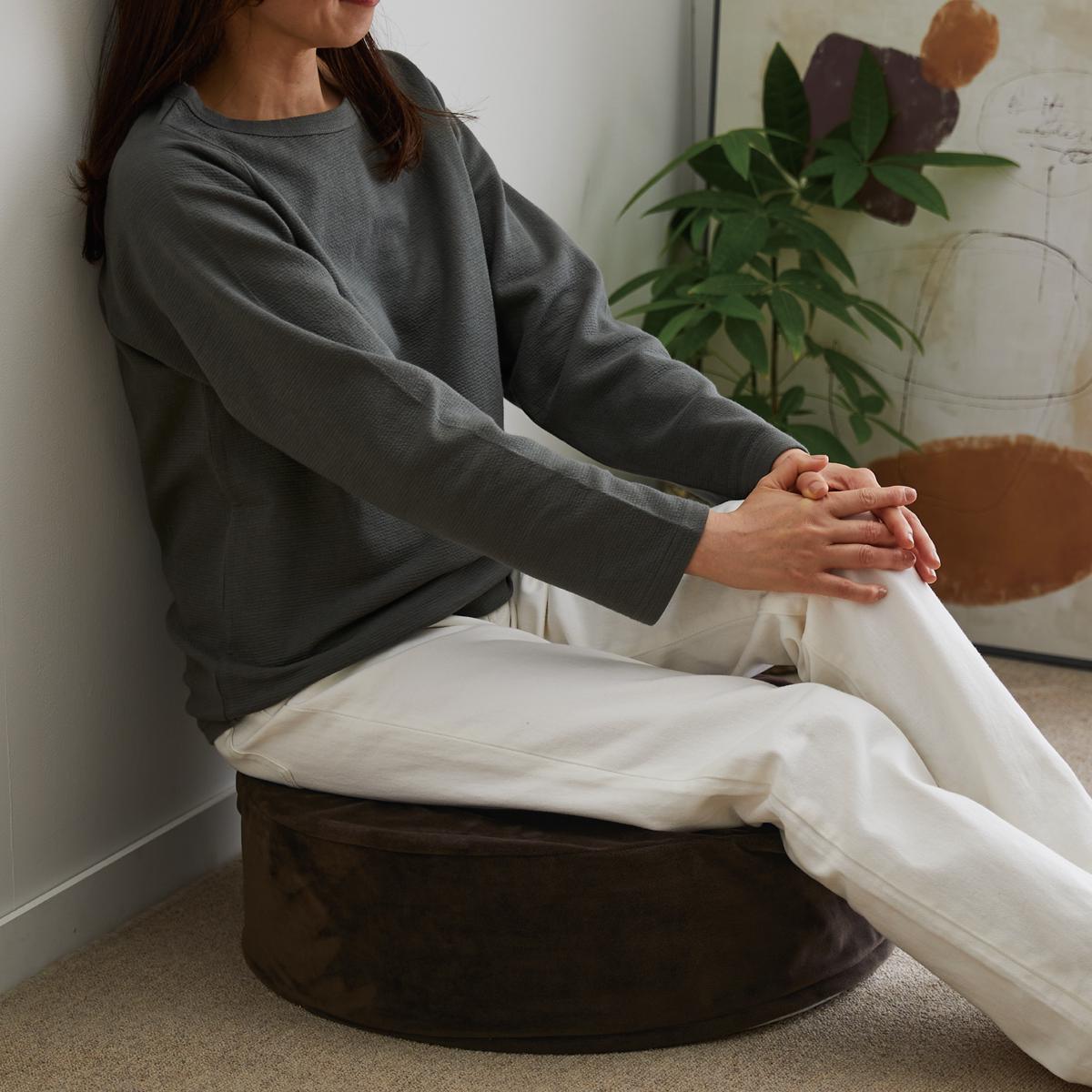 ブラウン系壁を背もたれがわりにリラックス。お部屋のアクセントにもなる、円形あぐらクッションです。