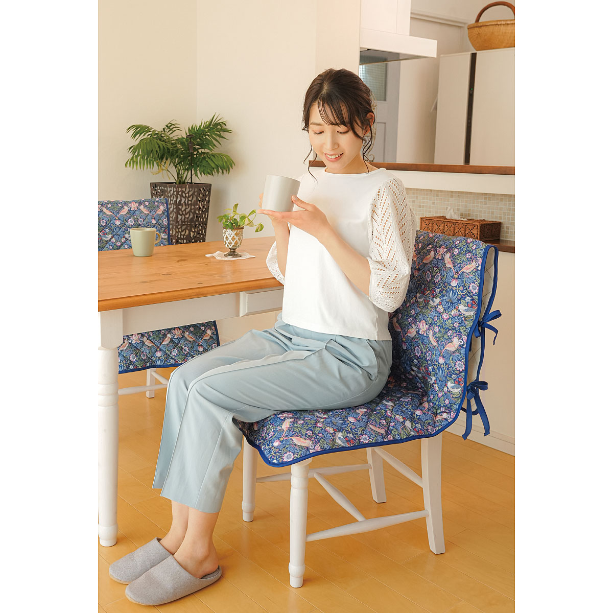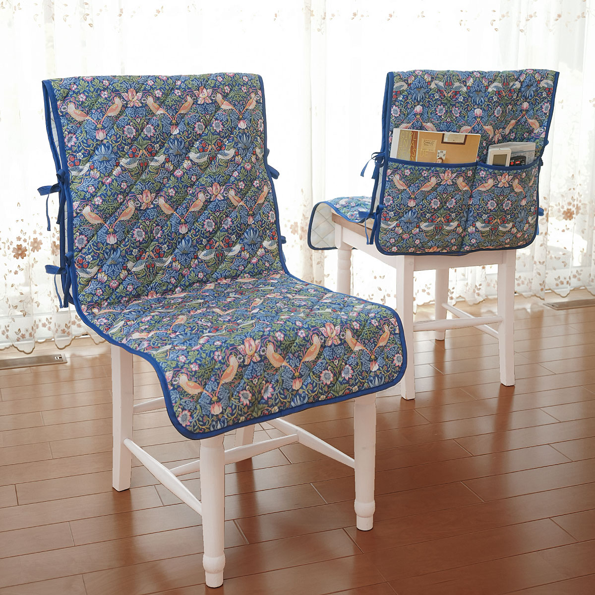 豊かな色彩と自然のモチーフに魅了されて。暮らしに彩りを与えるウィリアム・モリスの「いちご泥棒」をあしらったキルトチェアカバーです。中わた入りでふんわりとした座り心地。背面には便利なポケット付きです。