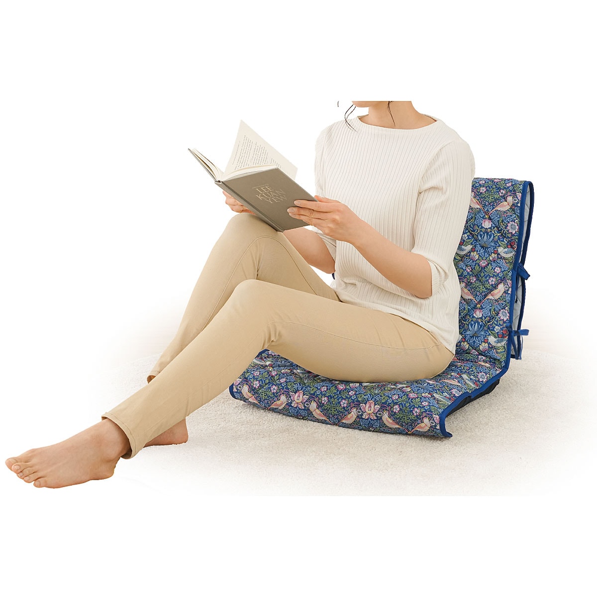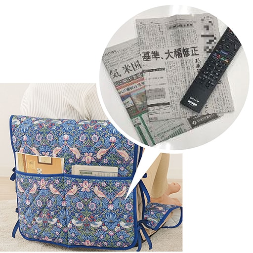 椅子にサッと掛け両サイドの紐を結ぶだけの、着脱簡単なチェアカバーです。深いブルーの美しさとイチゴをついばむ鳥たちが可愛らしい「いちご泥棒」は、19世紀ウィリアム・モリスによりデザインされたインディゴ抜染により、赤や黄色といった藍色以外の糸を取り入れた最初のテキスタイル。今もなお新鮮で魅力的です。背面にはA4サイズの書類もすっぽり入るポケット付きで、新聞やリモコンなどの定位置に。座椅子カバーとしても使えます。汚れたらご家庭の洗濯機で気軽に洗えます。