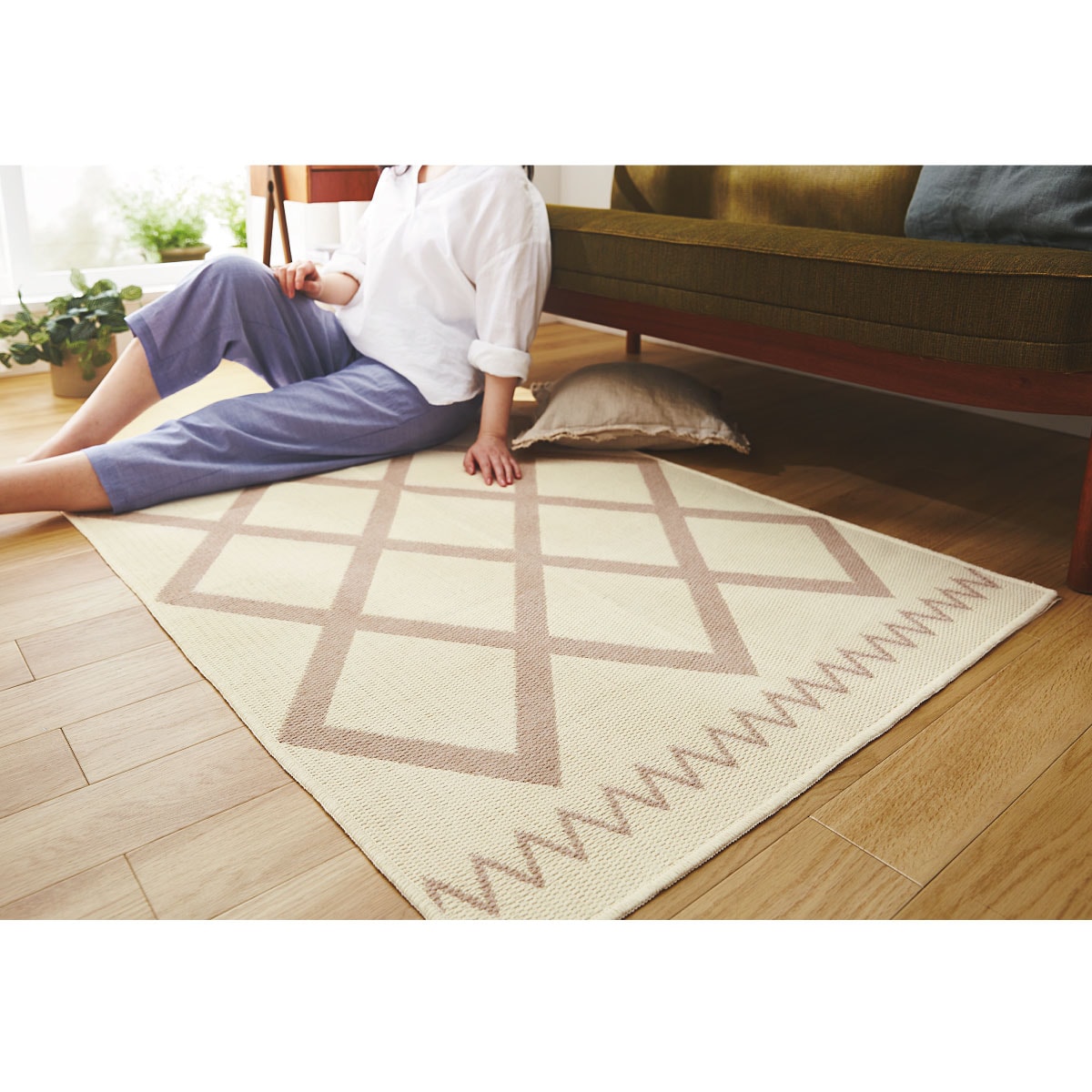 爽やかな踏み心地でベタつきにくく、汗ばむ季節でも快適に過ごせる綿混平織りラグです。おしゃれなベニワレン柄がお部屋のアクセントに。表と裏で柄の色が反転するので、季節やお好みに合わせて雰囲気を変えられます。コンパクトにたためるので収納にも場所を取りません。ホットカーペット・床暖房にも対応しています。汚れたらご家庭の洗濯機で気軽に洗えるので、清潔にお使いいただけます。