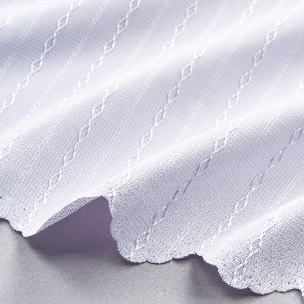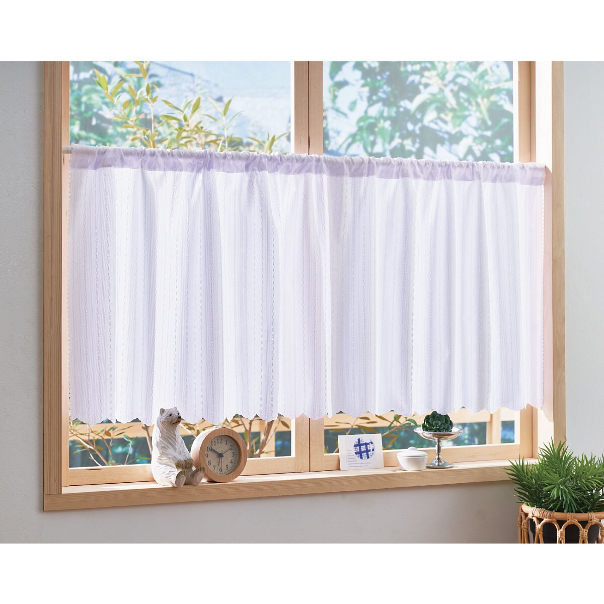 外側にミラー効果のある扁平糸を使い、中に2層の遮熱糸をはさみ込んだ5層構造で紫外線をカット。UVカット率はなんと99%のレースカフェカーテンです。ミラー効果で昼も夜も外からの視線を遮り、プライバシーを守ります。遮熱効果も高いので冷暖房効率もアップ。裾・サイドは超音波カットされたシンプルなスカラップデザインです。玄関や階段横の明かり取り窓の目隠しや、日差しの強い小窓にもおすすめです。