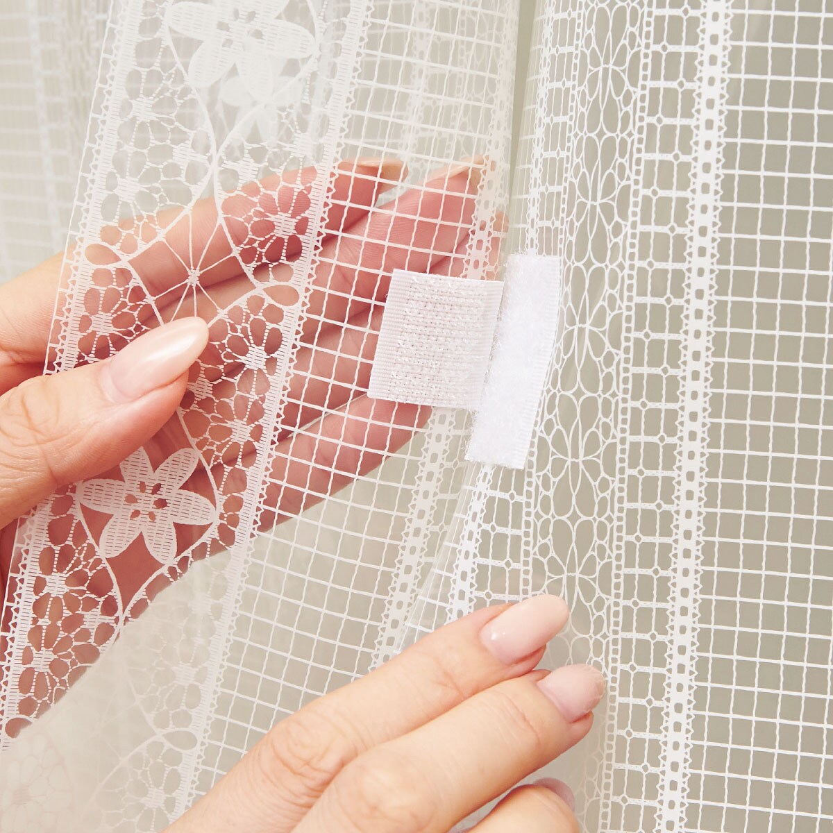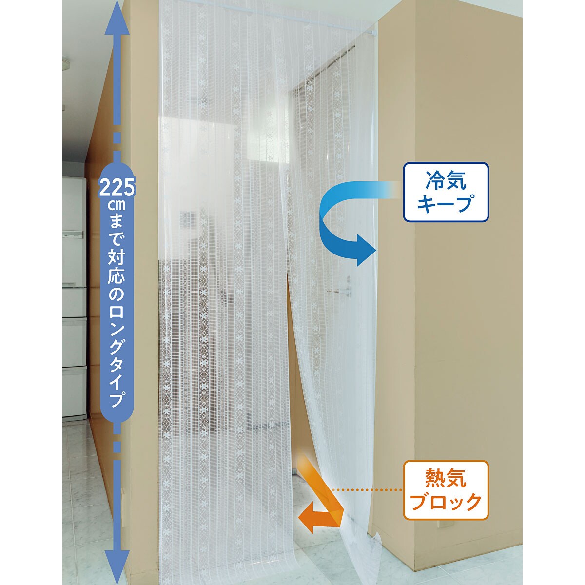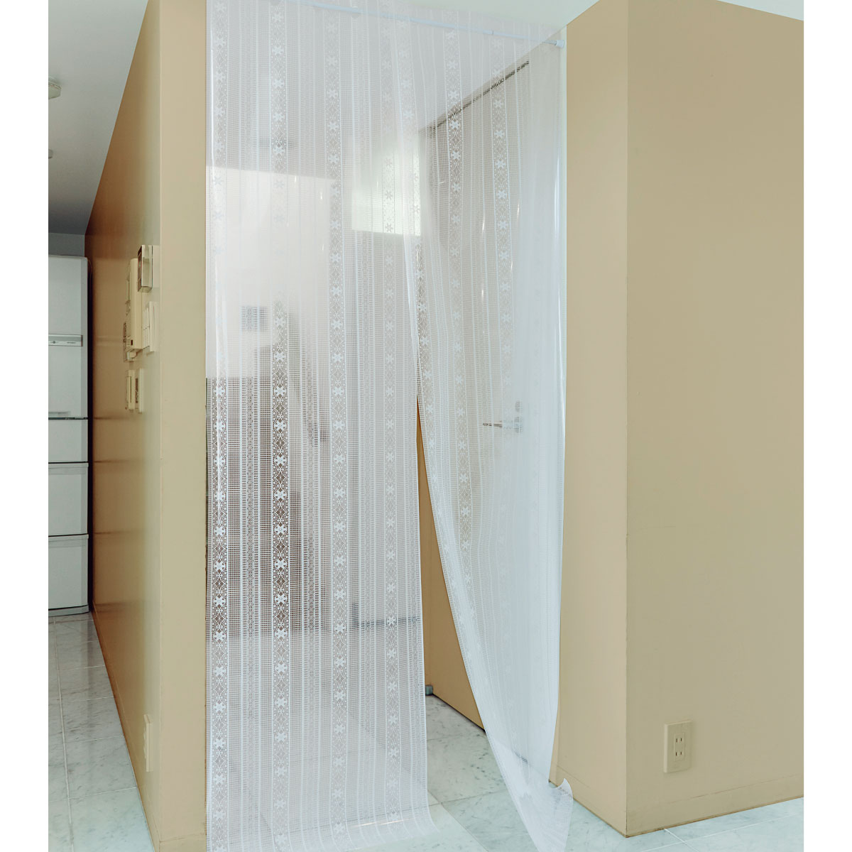 ちょい足しで冷暖房効率アップ! 階段や廊下、勝手口に取り付けるだけで熱気や冷気をガードできるシートです。お好みの長さにカットできるのですき間を作らず、お部屋の空気を逃がしません。ワンタッチで開閉できる面ファスナーテープ付きで、出入りもスムーズ。ほどよい透け感と上品なレース模様入りで、インテリアにもなじみます。突っ張り棒に通すだけなので、セットも簡単です。