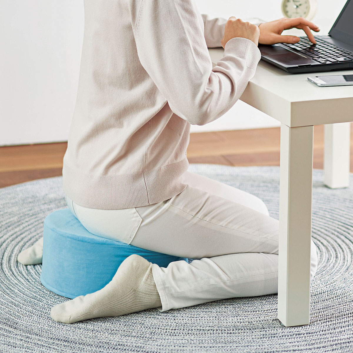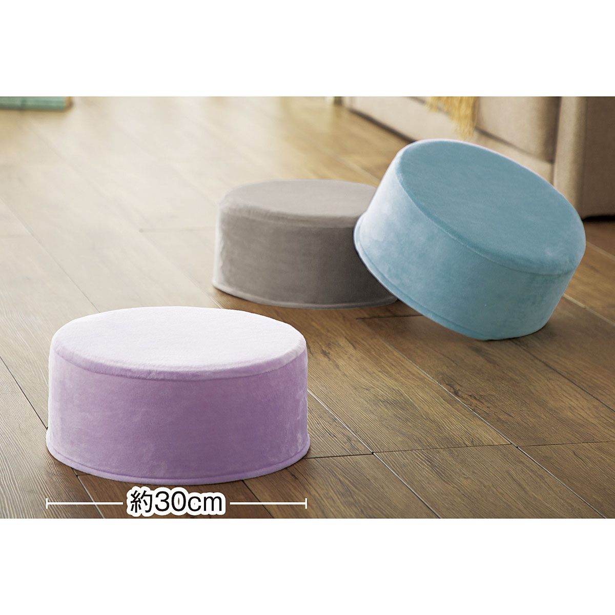 長時間座っても疲れにくい! ウレタンフォームとポリエチレンの2層構造でお尻をしっかりサポートするラウンドクッションです。軽くて持ち運びやすく、正座やあぐらもかけるのでちょっとしたデスクワークにも便利。座布団の代わりとしても、寝転んだときの肘置きや枕にするのもおすすめ。ベロア調生地のやさしい肌ざわりとほどよいクッション性で、1年中心地よく使えます。