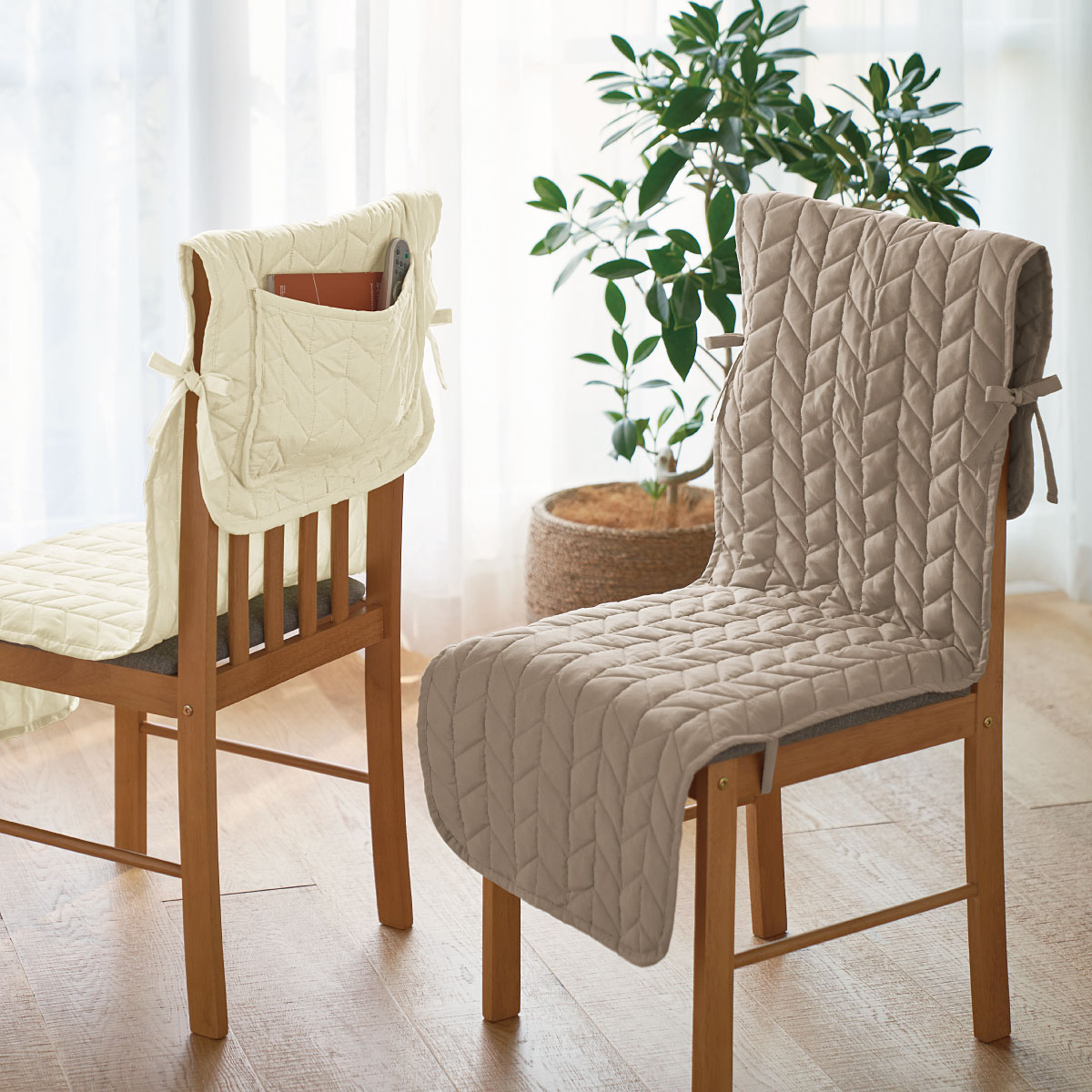 サッと被せるだけで、いつものチェアが一新! なめらかな肌ざわりで、季節を問わず一年中気持ちよく使えるキルトチェアカバーです。背面には便利なポケット付きで、新聞やリモコンなどの定位置に。紐を結ぶだけの簡単装着で、付け替えもラクラクです。座椅子の汚れ防止用としてもおすすめ。ご家庭の洗濯機で丸洗い可能なので、いつも清潔に使えます。